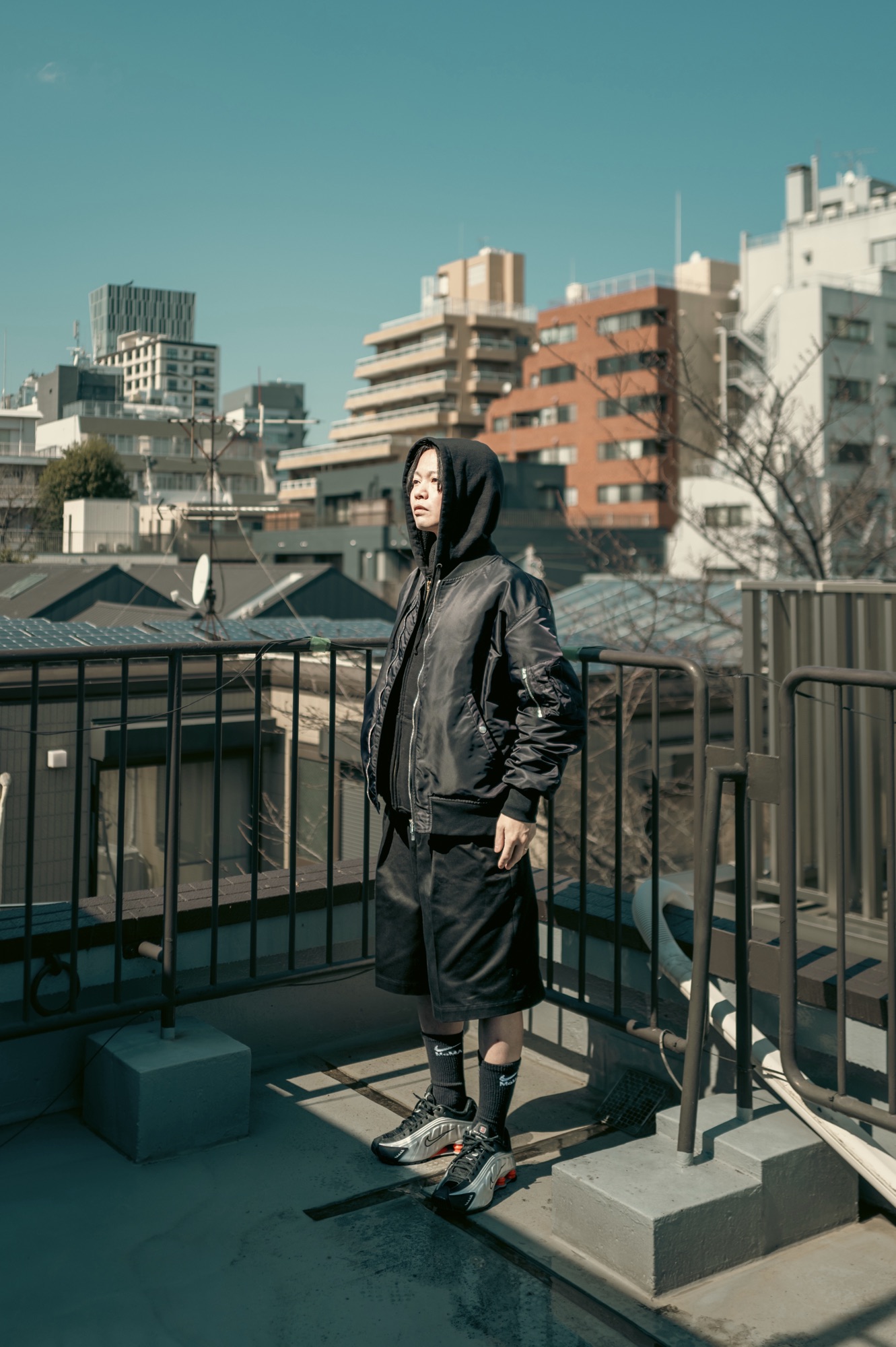 普段からスニーカーしか穿かない人もいると思う。先ほどから散々ショーツのスポーティーさを相殺するスタイリングばかり紹介してきたが、逆にそのスポーティーさを活かすスタイリングも紹介したい。ショーツにスニーカーを合わせるとスタイリングはどう頑張ってもカジュアルに寄る。それはAvilaが如何に綺麗目なショーツであっても抗えないことだ。なのでいっそのことスポーティーなスタイリングに全振りしてみてほしい。スタイリングイメージはバスケットボール選手の普段着だ。