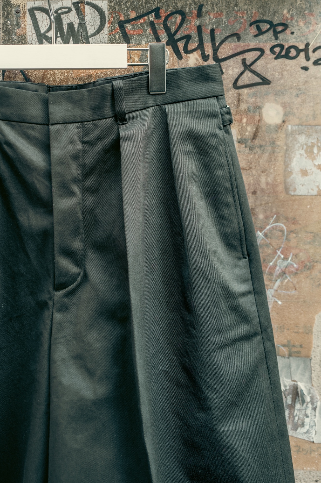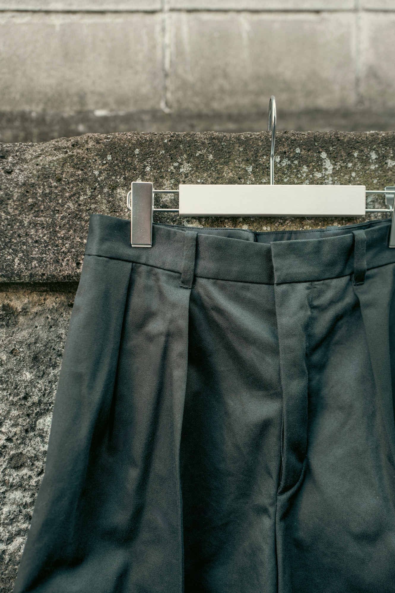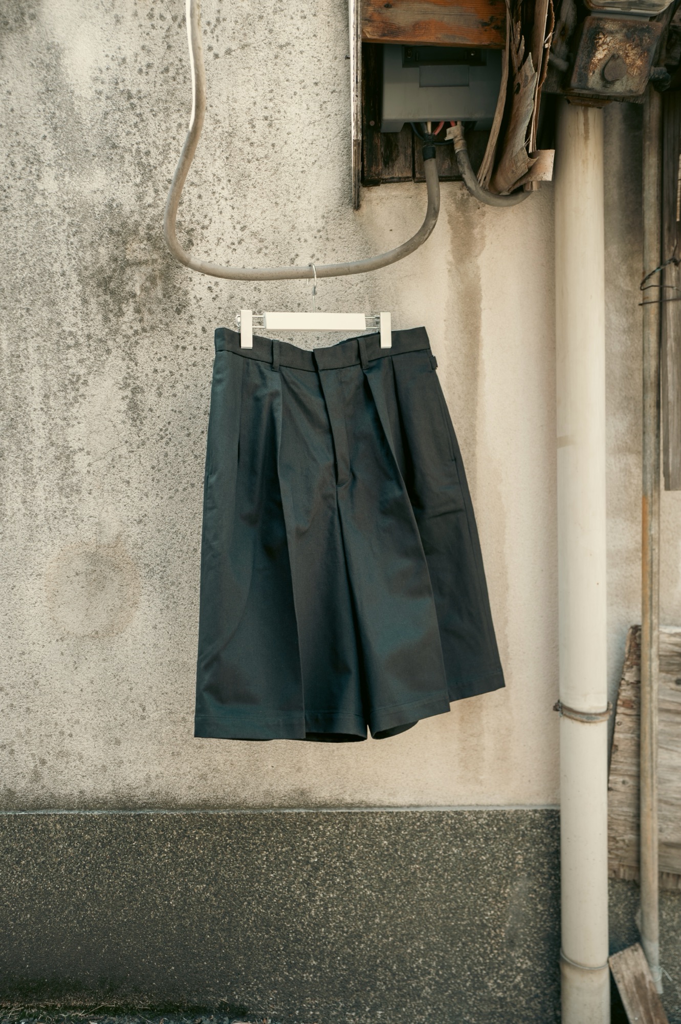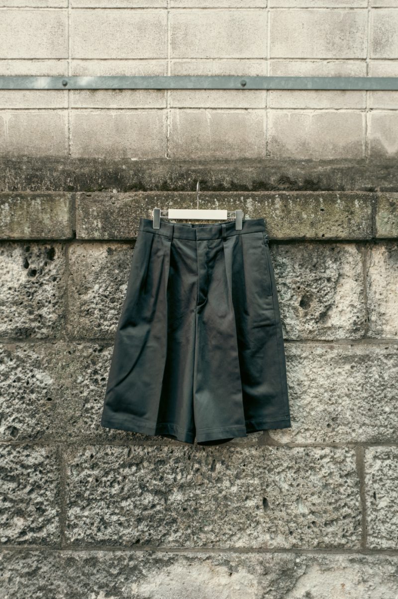 ワイドショーツは脚のシルエットを拾いにくいので、体型を選ばず幅広い人にリーチする一本に仕上がっていると思う。そしてワイドショーツのボリュームとハリ感のあるカツラギ素材の恩恵で脚とショーツの間に空間のゆとりが生まれ、穿いていて非常に涼しく快適だということもお伝えしたい。生地が厚いと穿いていて暑いのではないかと心配する方もいるが、恐らくは杞憂に終わると思う。主観だが夏場にデニムを穿いて過ごすよりも1万倍快適なはずだ。