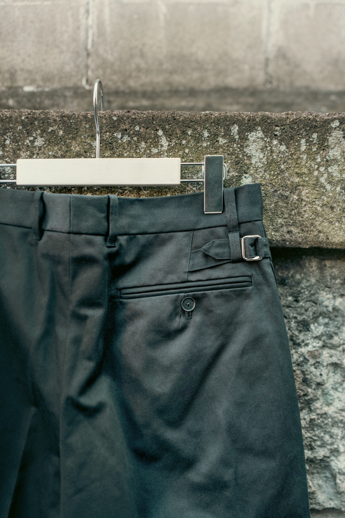 生地は肉厚でハリ感のあるカツラギ素材を使用している。程良い光沢感と綾織のテクスチャの両方を味わえる生地なので、ドレスやスポーツ・ストリート等幅広いスタイリングと調和してくれる。ご存じの方も多いと思うが、カツラギは綾織り(ツイル素材)の一種で、厚みがありながらも特有の柔らかさが味わえる素材だ。厚みのある生地だからこその耐久性と、平織りの生地に比べて皺になりにくいことも魅力で、つまりはヘビーユースで使い倒せる生地だということをお伝えしたい。