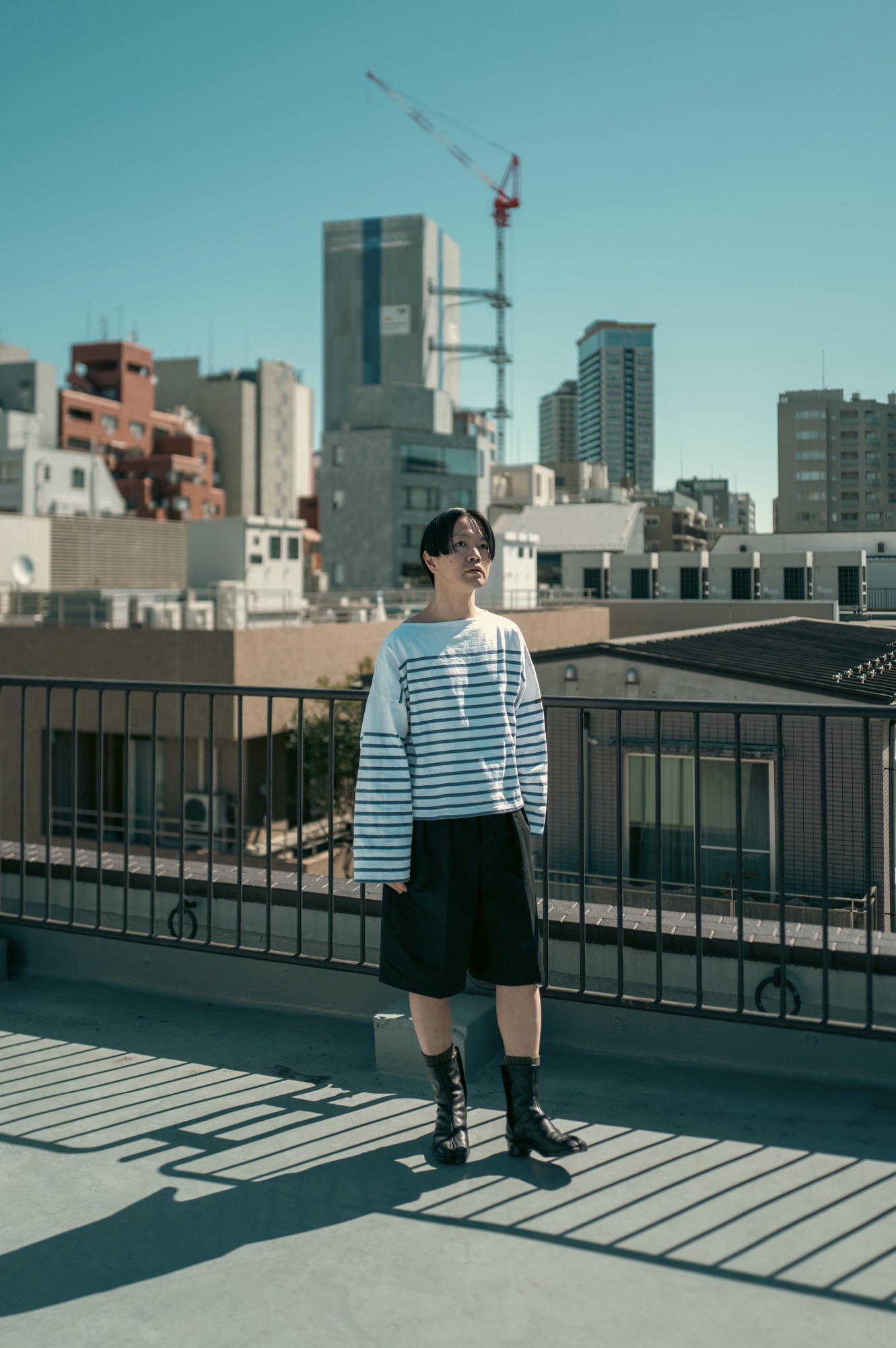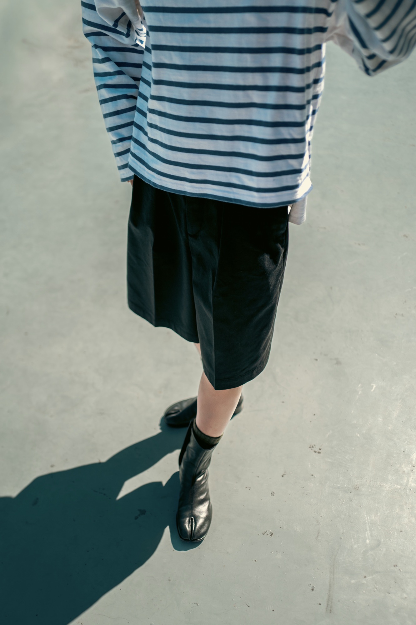 新型ショーツAvila自体にボリュームがあるので、いつも着ているシャツやカットソーと合わせてもメリハリのあるスタイリングが完成するが、このショーツのボリュームを活かす方向でスタイリングを組むのも面白いと思う。せっかくの膝下丈のワイドシルエットだからこそ、例えばブーツを合わせてみるのも良いはずだ。