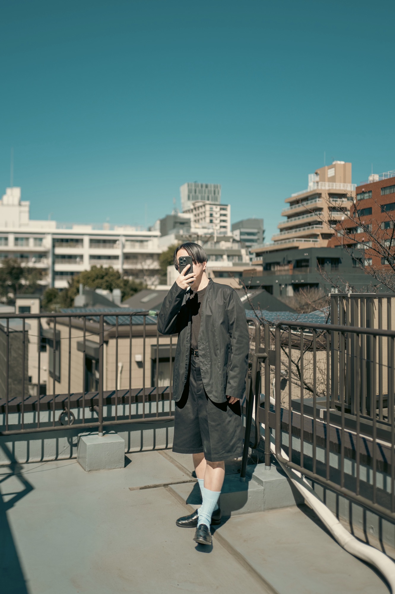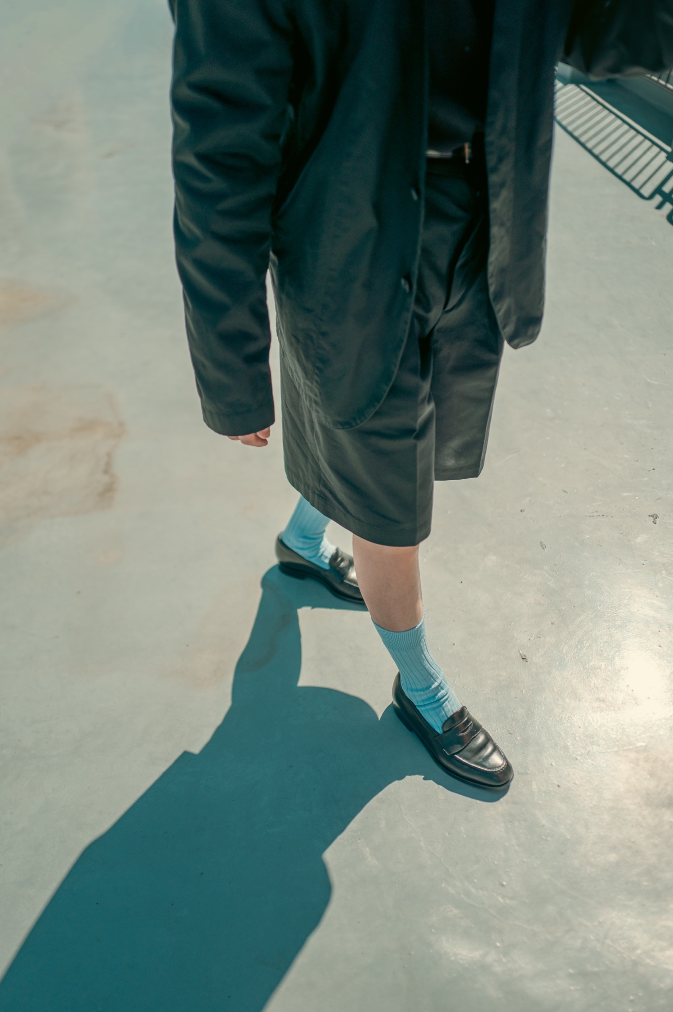 例えば上の写真のように綺麗めなアイテムを組み合わせてスタイリングを組むのはどうだろうか。この時はジャケットにハイソックスにローファーを合わせている。ショーツがカジュアルならばそのカジュアルさを他のアイテムで相殺してしまえば良い。カジュアルアイテムのショーツ(アイテム数1)に対して、綺麗目アイテムのローファーとジャケットとハイソックス(アイテム数3)なので、綺麗目なテイストが2点勝る。小学生でも分かる足し算と引き算だ。綺麗目なテイストのアイテムの点数が多いということは、この文脈でショーツを穿くと『ハズし』のアイテムになる。ハズしはスタイリングを組む際にとても重要な要素だし、それがこんなに単純なことで得られてしまうのだから旨みしかない。特にうちのお客さんは綺麗目のスタイリングを好む方が多いようなので、いつものスタイリングに試しにこのショーツを組み込んでみてほしい。それだけでハズしになる。