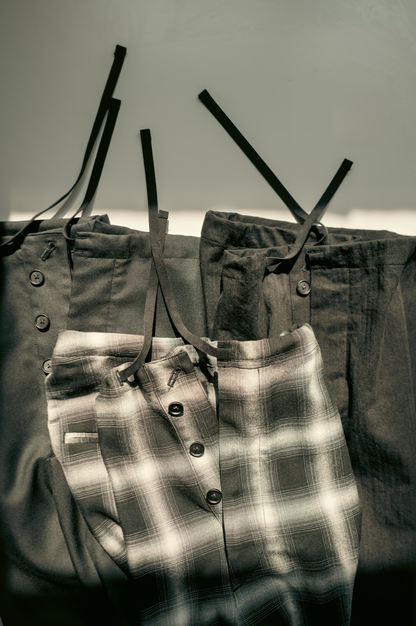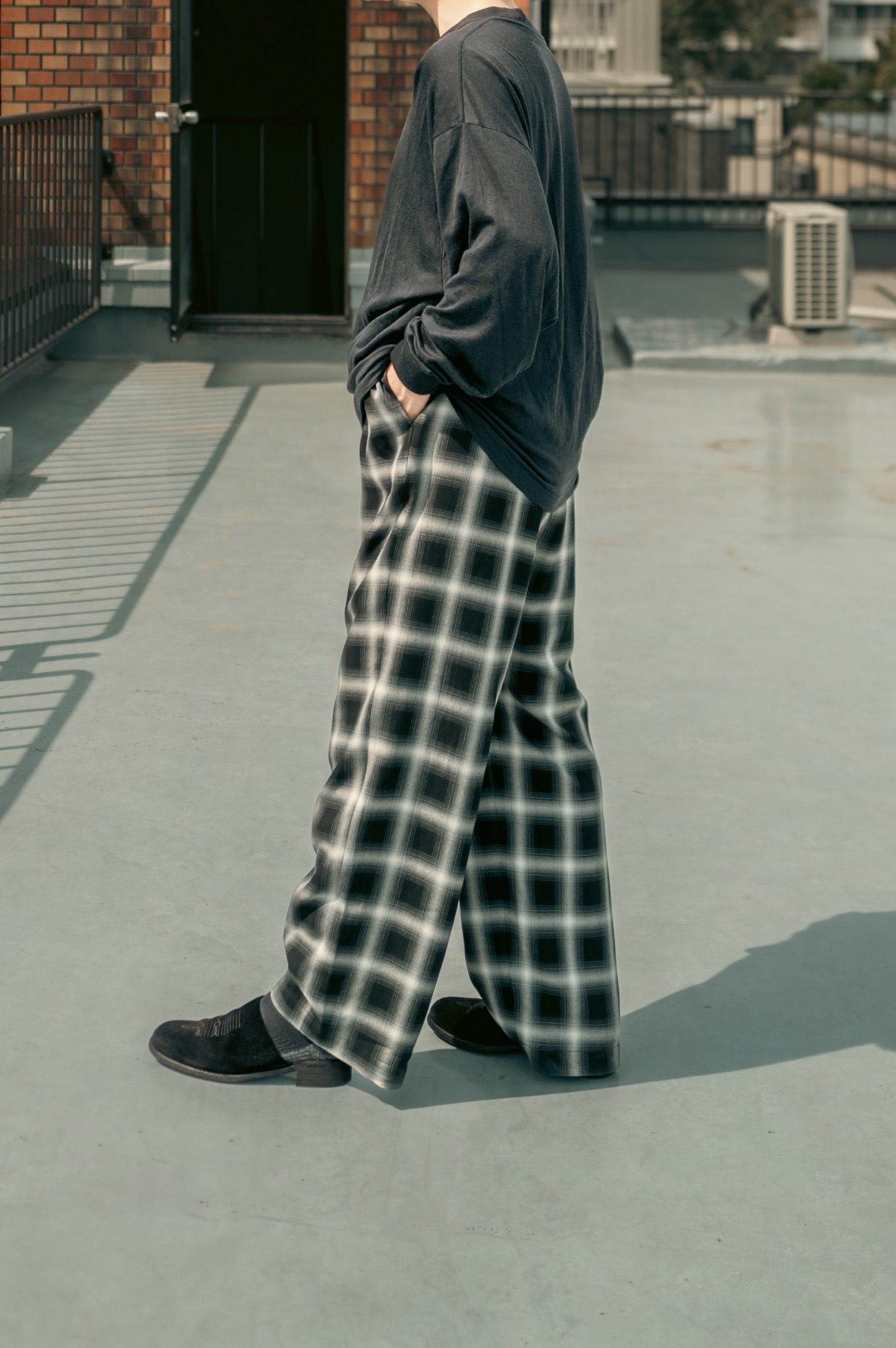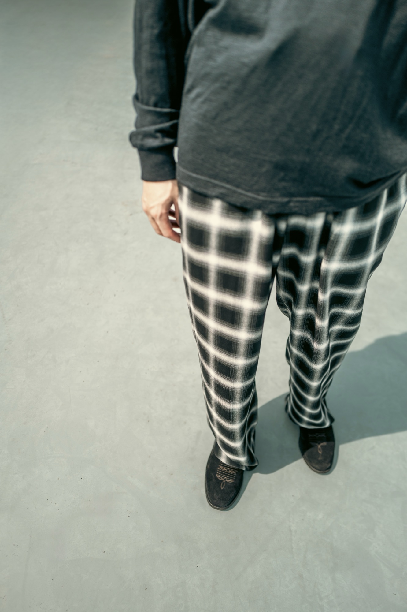 お店にくるお客さんの夏のスタイリングを見ていても、特に夏場は皆似たような服装になっていると感じる。汗をかくので当然ながら上下共に洗濯可能な素材のアイテムを着用していて、特にパンツはデニムか軍パンのことが殆どだ。トップスに色物や柄物を持ってきたりシルエットに変化をつけて差別化を図る人もいるが、基本的に皆上半身にポイントを置いているように思える。だからこそこのタイミングで僕はチェックパンツを提案したい。新作のチェックパンツが発売開始した。