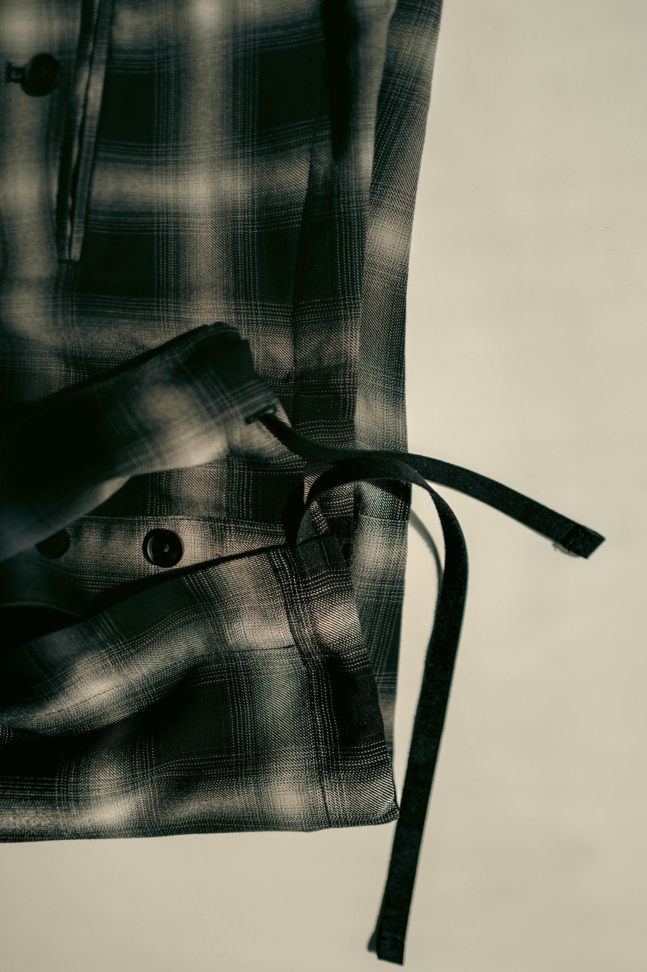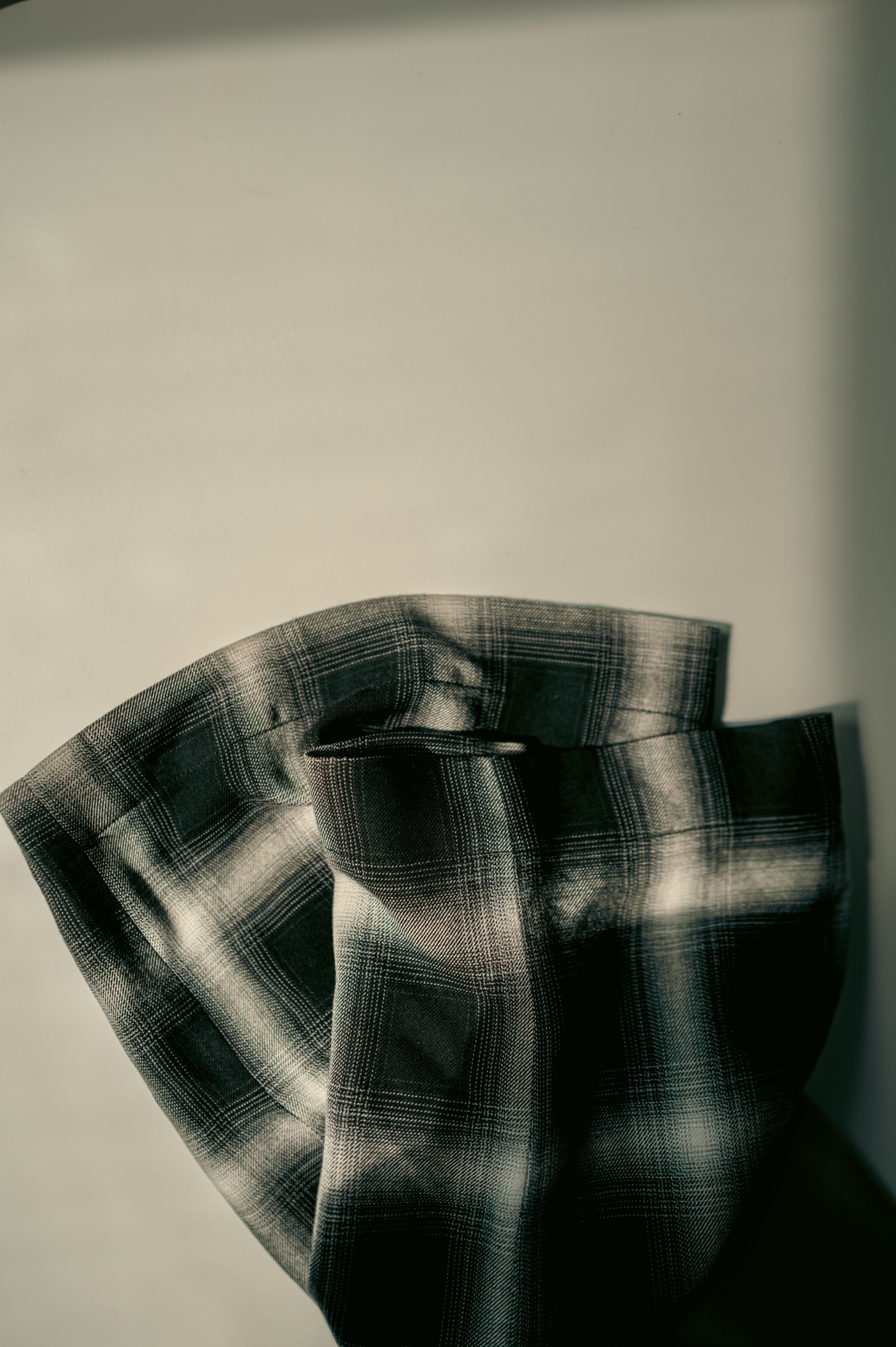 このチェック柄の素材に見覚えのある方もいると思うが、過去にオープンカラーシャツCeltyで使った生地と同じものだ。そもそもが肌当たりが柔らかいレーヨン素材なのだが、着用と洗濯を繰り返すとよりフワフワと柔らかく育ってくれる。僕は売り場で『バスタオルみたいに汗を吸う』とお話ししている。素肌にこの素材が触れた時の幸福感は言葉では言い表せない。