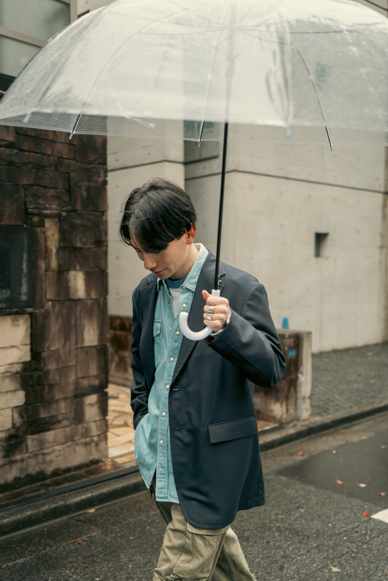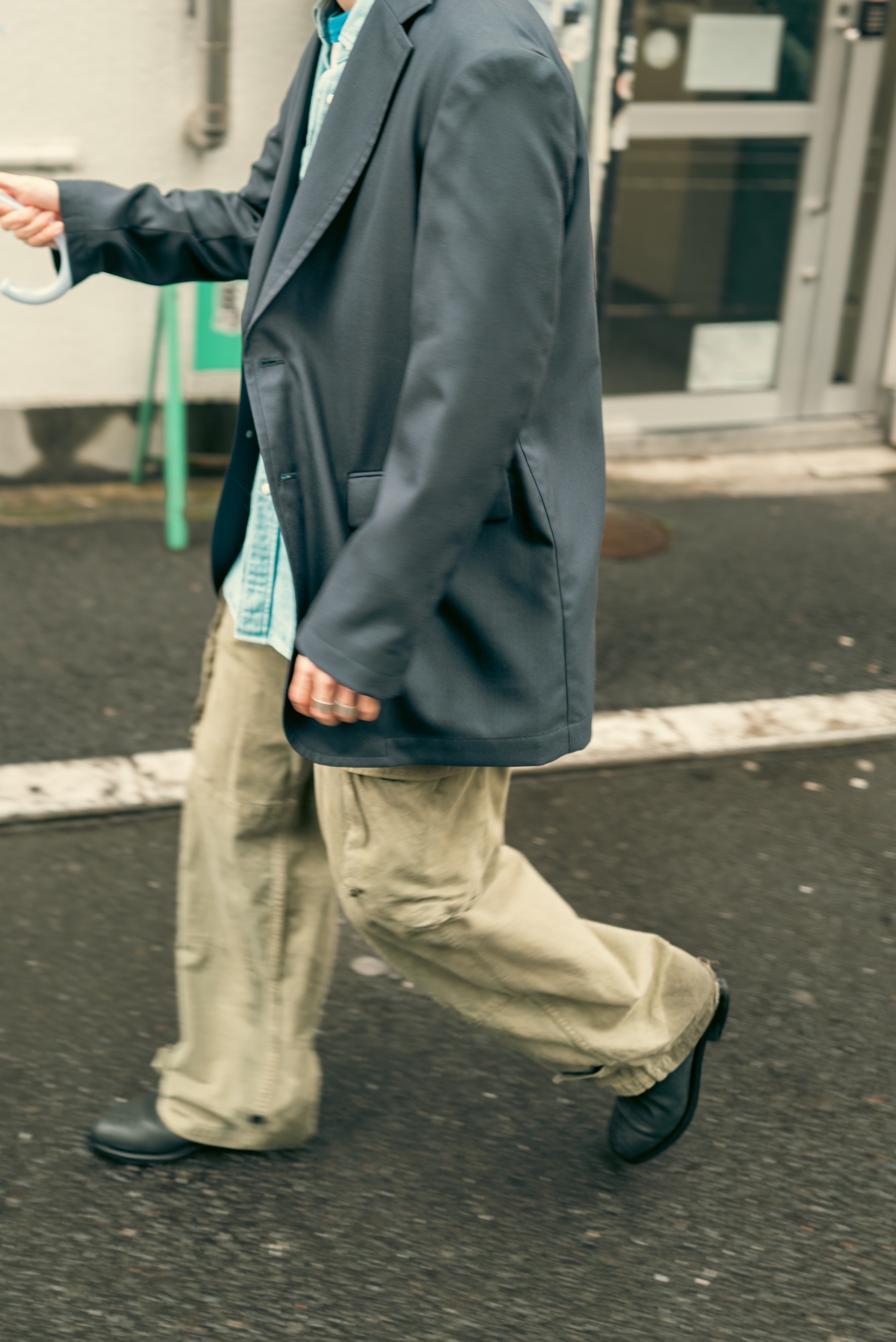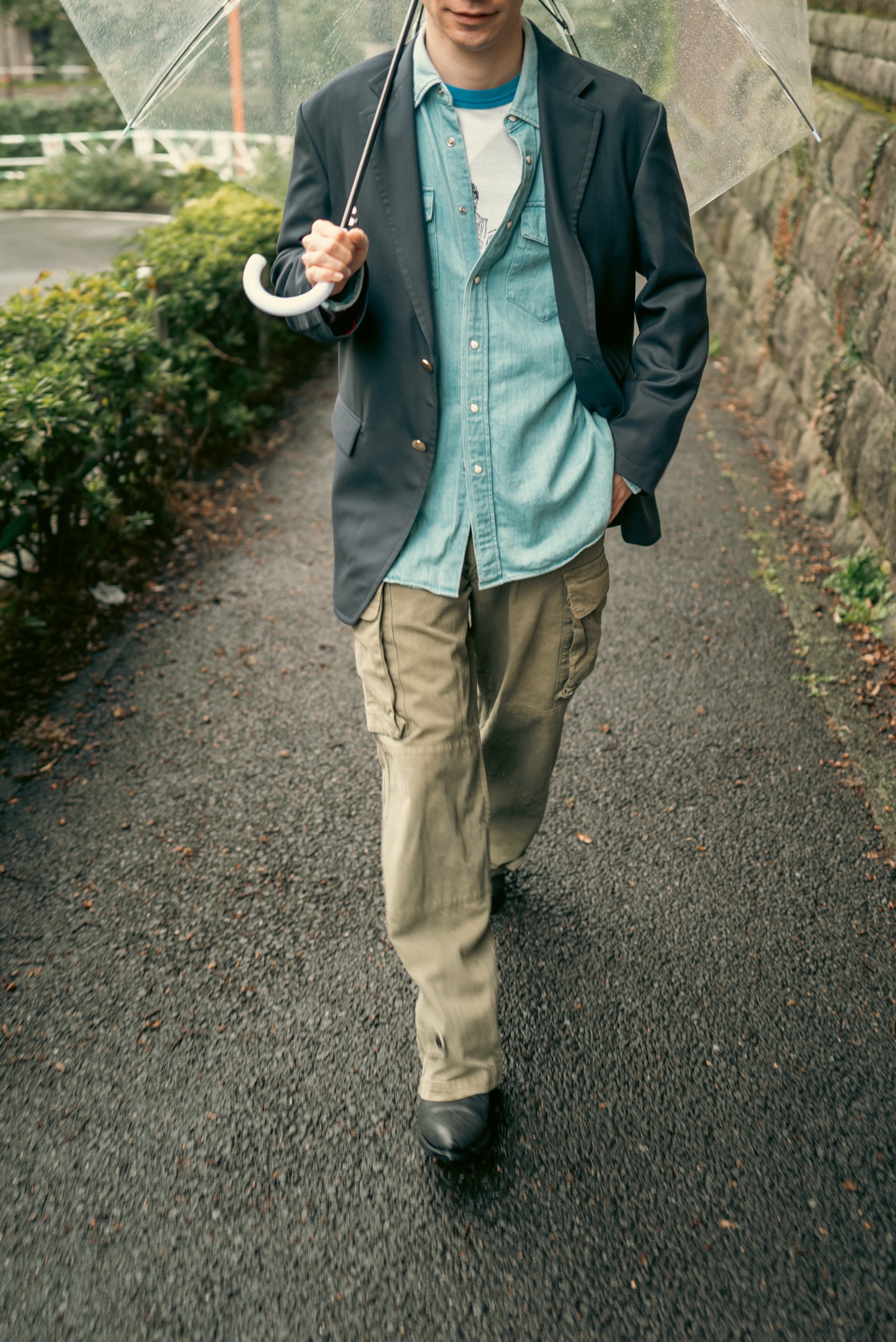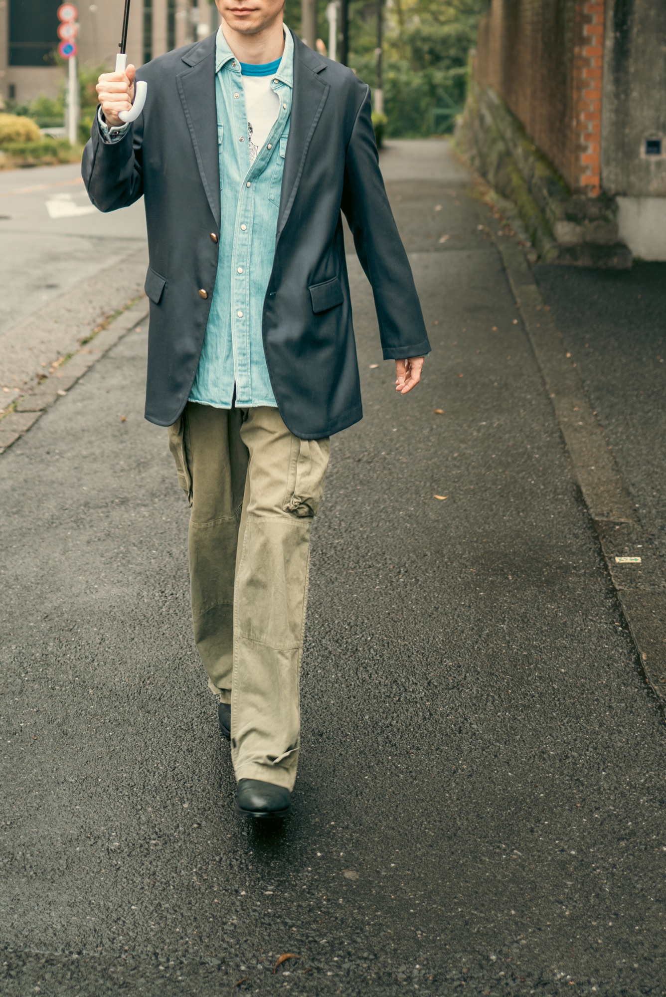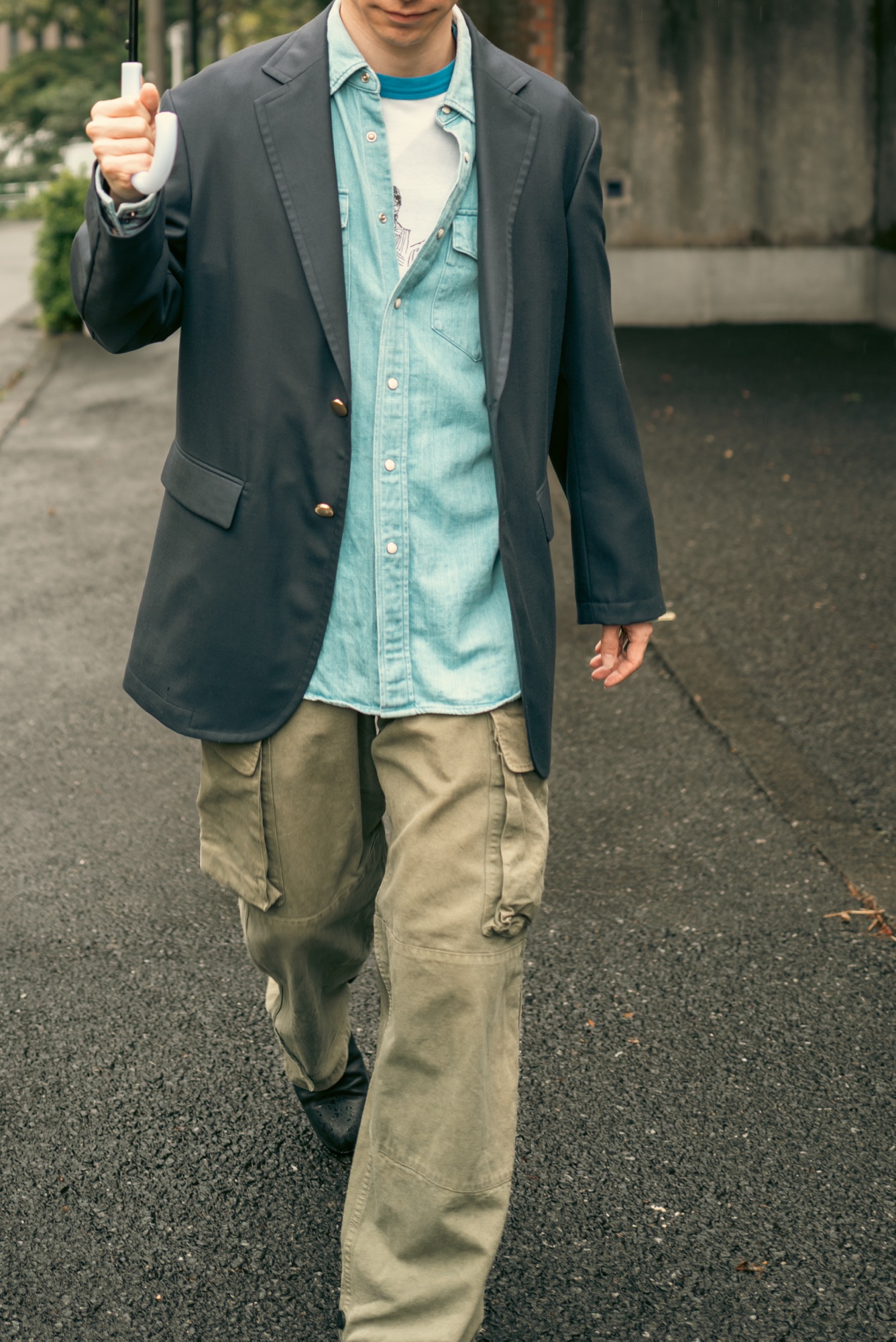 どんな服に合わせてもシルエットと生地感で品の良さは担保したデザインになっているのはいつも通り。この辺りの塩梅はデザイナーが例の如く上手く着地させてくれている。この撮影の日のようにリンガーTやウエスタンシャツ、着古したM-47パンツと合わせても纏まってくれるので、きっと想像している以上にこのネイビーブレザーはスタイリングの間口が広い。