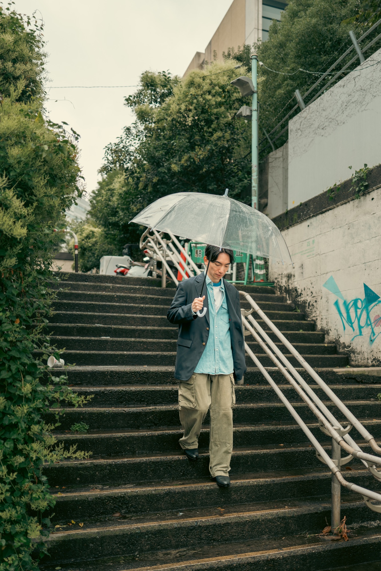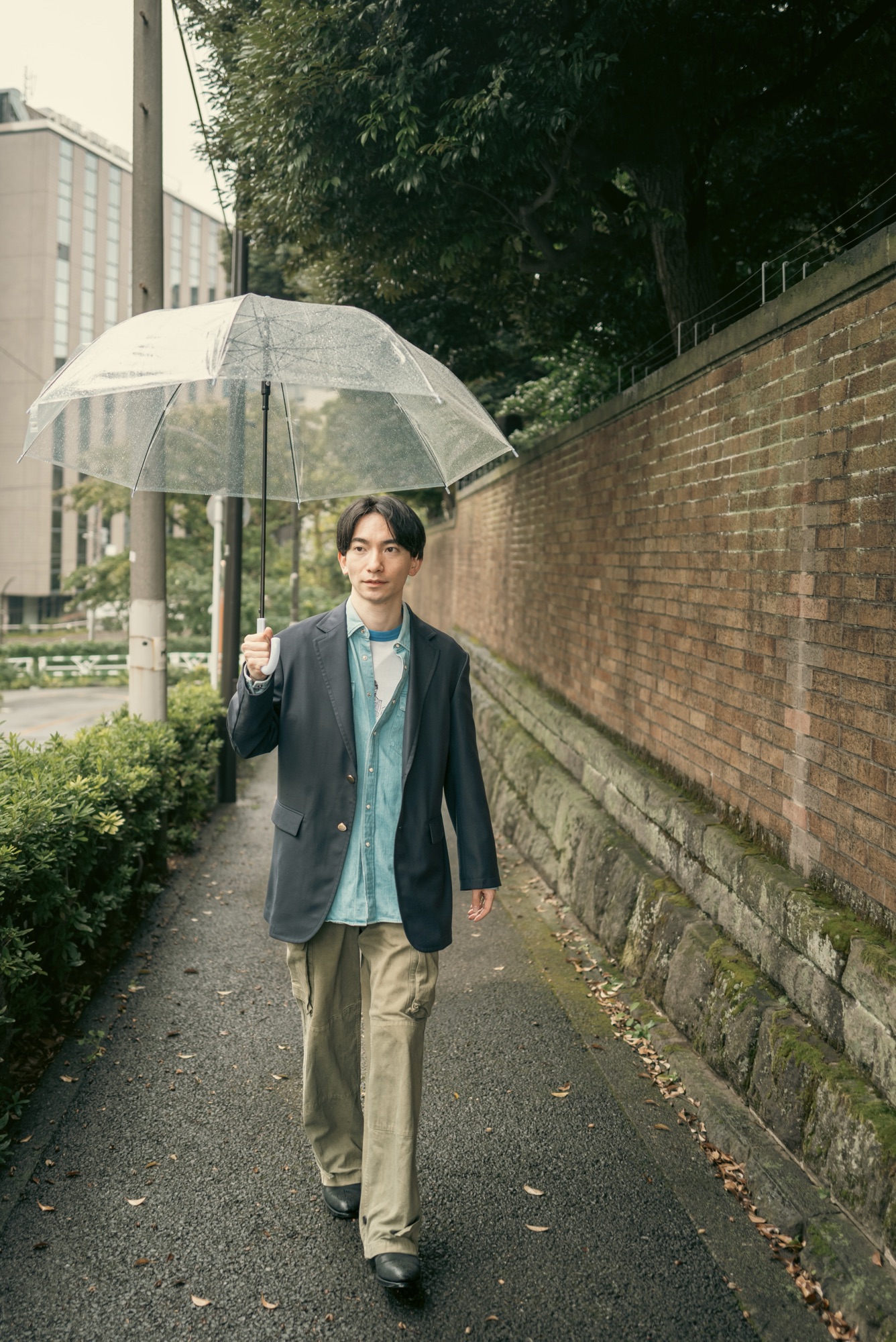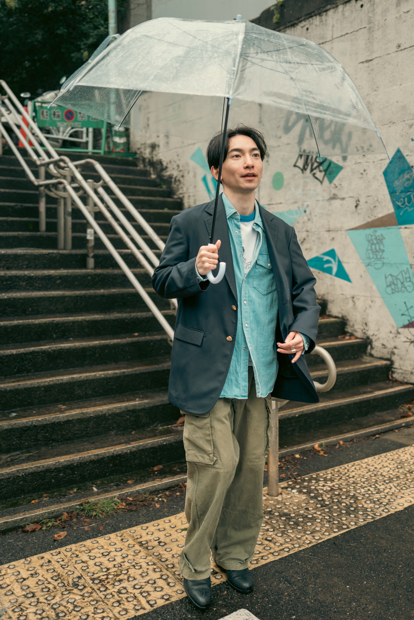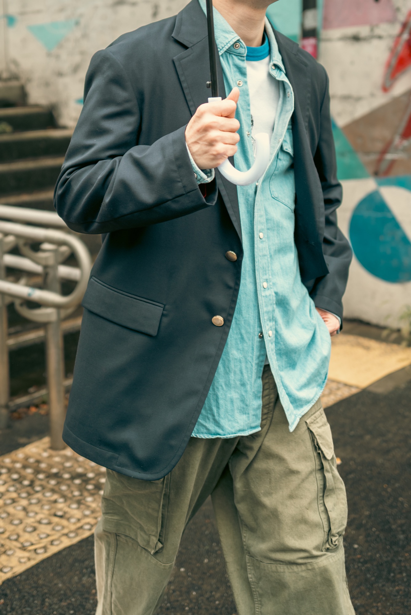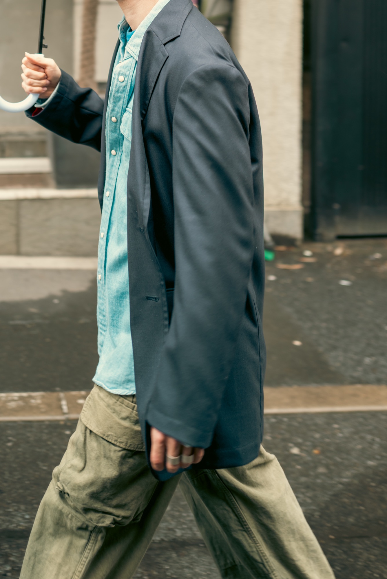 どんな服に合わせてもシルエットと生地感で品の良さは担保したデザインになっているのはいつも通り。この辺りの塩梅はデザイナーが例の如く上手く着地させてくれている。この撮影の日のようにリンガーTやウエスタンシャツ、着古したM-47パンツと合わせても纏まってくれるので、きっと想像している以上にこのネイビーブレザーはスタイリングの間口が広い。