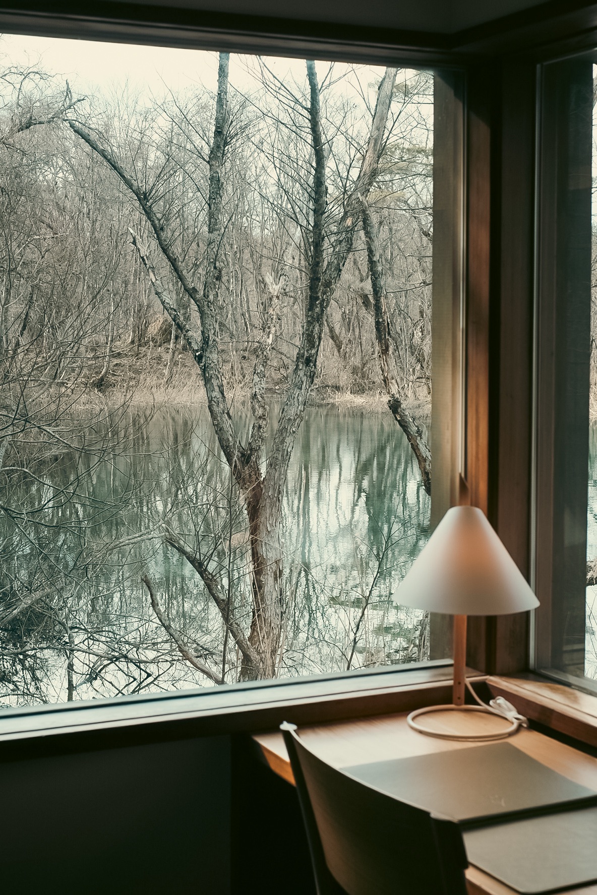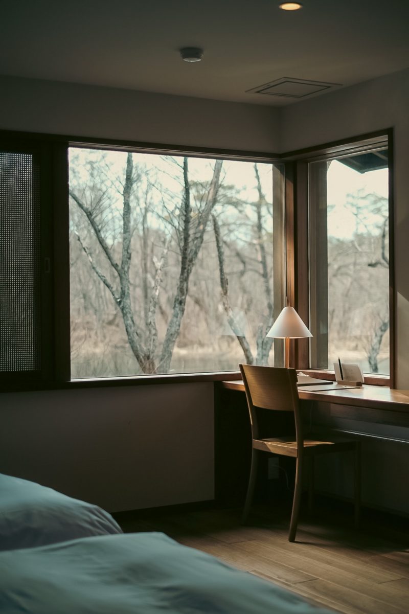 アアルトでは複数の異なるタイプの部屋を選ぶことが可能だが、僕は別館の105号室を推したい。まずアアルトの宿泊は本館と別館から選択可能なのだが、別館は全ての部屋が温泉の部屋風呂付きになっている。しかも部屋の目の前には沼地をはじめとした湿地帯が広がっており展望も良好で、とりわけこの105号室からの眺めが一番気に入った。庶民の僕にはなかなかパンチの効いた宿泊費だったけれど、福島の美味しい食材とお酒をふんだんに楽しめる食事二食(今でもたまに夢に出てくるくらいには美味しかった)付きで、かつ自由気ままに温泉に入り放題でこの値段なら、ちょっと奮発してしまおうかという気持ちにはなる。滞在中の殆どの時間は写真の椅子に座って過ごした。本を読んだり外の景色を眺めるのには最高のコーナースペースだったと思う。ちなみに温泉には5回入った。