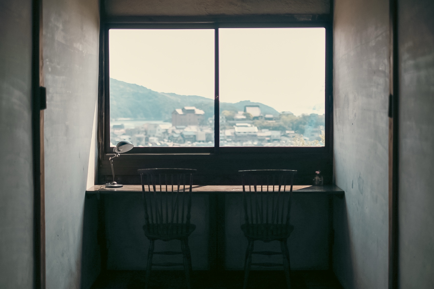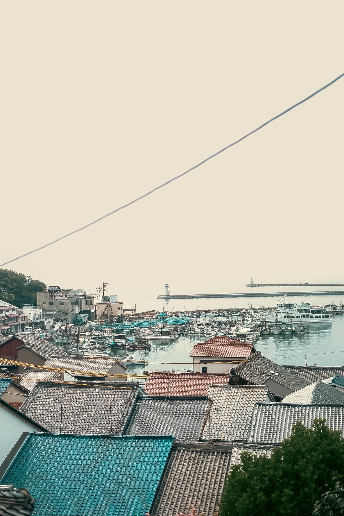 江の浦に泊まりたかった一番の理由が、この二階からの展望だ。椅子二つが並ぶ窓からは、鞆の浦の港町の景色が一望出来る。高台の立地にあることもあってか遠くの景色がよく見えるし、鳥の囀りや船のエンジン音に耳を澄ませながら何もせずにぼーっとするにはうってつけの空間だった。滞在中はほぼ全ての時間をここで過ごした。ここからの景色はいくらでも見ていられる気持ちになる。