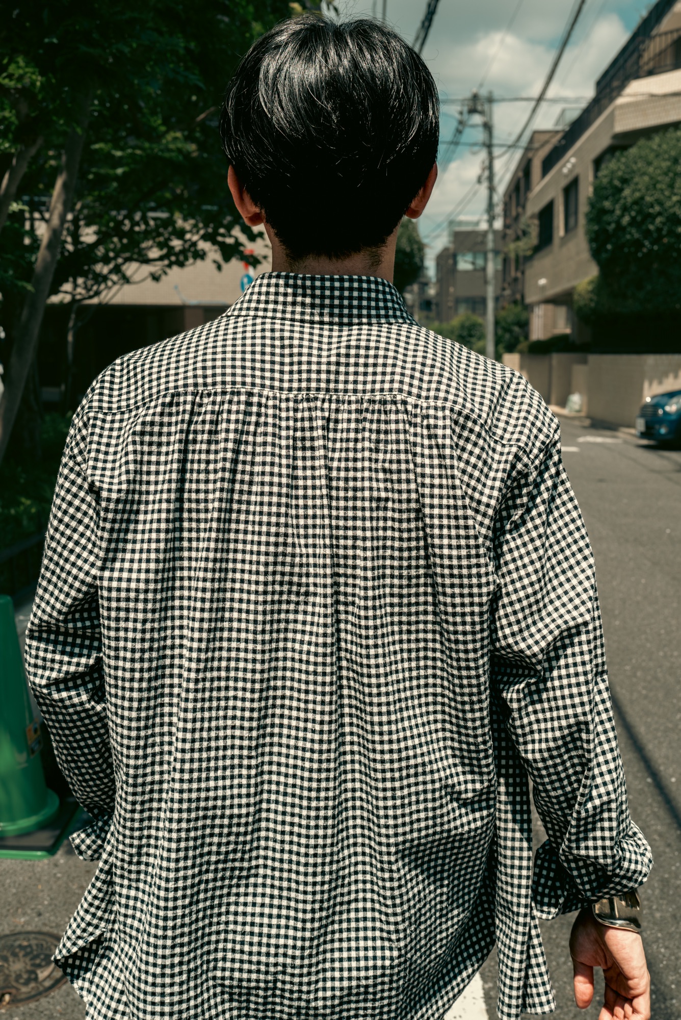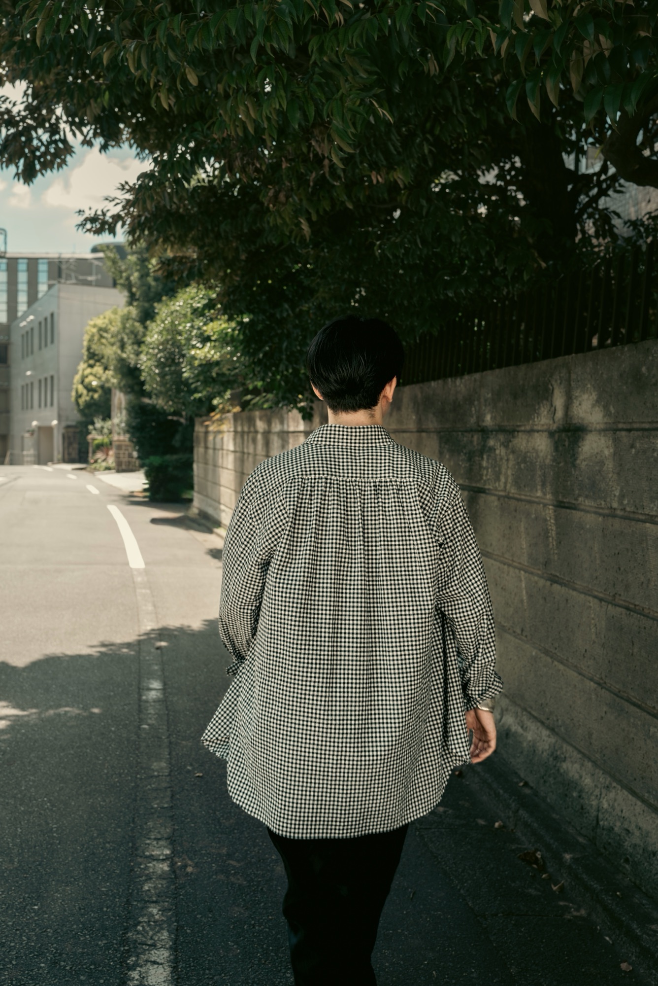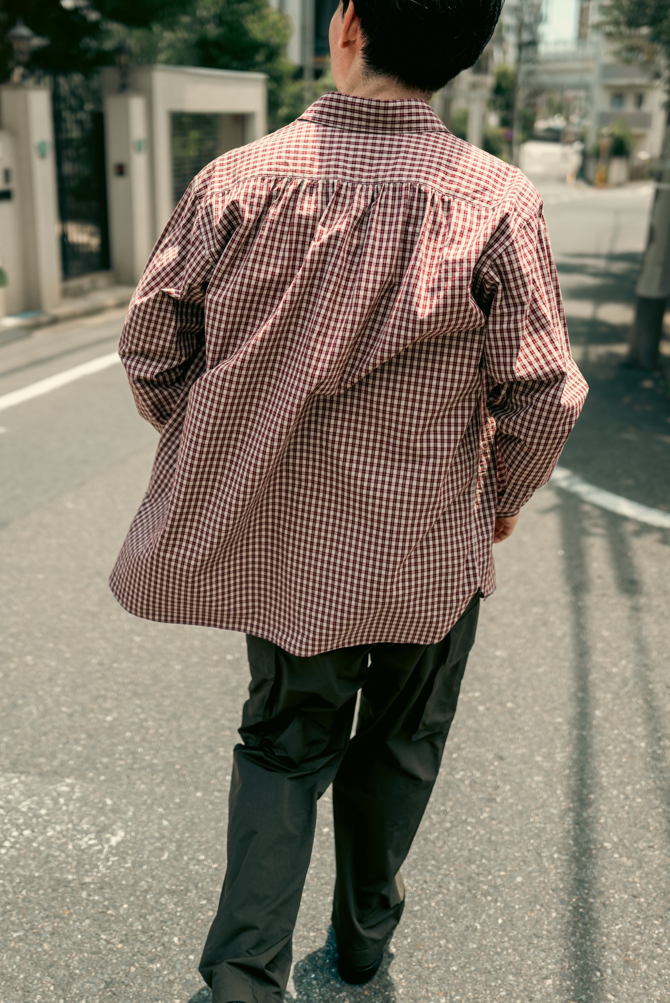 チェック柄を選ぶ際に意識したのがカントリー感だ。生地で見たときはそこまで意識していなかったけれど、実際に仕上がってきたサンプルを見てみたら想像以上に牧歌的だった。イメージとしては実家のテーブルに敷かれているテーブルクロス柄。あまりにも平和なイメージで笑みが溢れる。フェミニンな要素なギャザーシャツに、生地とシルエットでマスキュリンな要素を加え、そこにチェック柄で牧歌的な和やかさをプラスしてみた。あくまで個人的な体感値にはなるが、こうした複数の要素が喧嘩せずに調和している服は探すとなかなか見つからない。そして複数の要素がある服は要素の数だけ合わせやすいスタイリングが増える。つまりは使いやすい服だということだ。