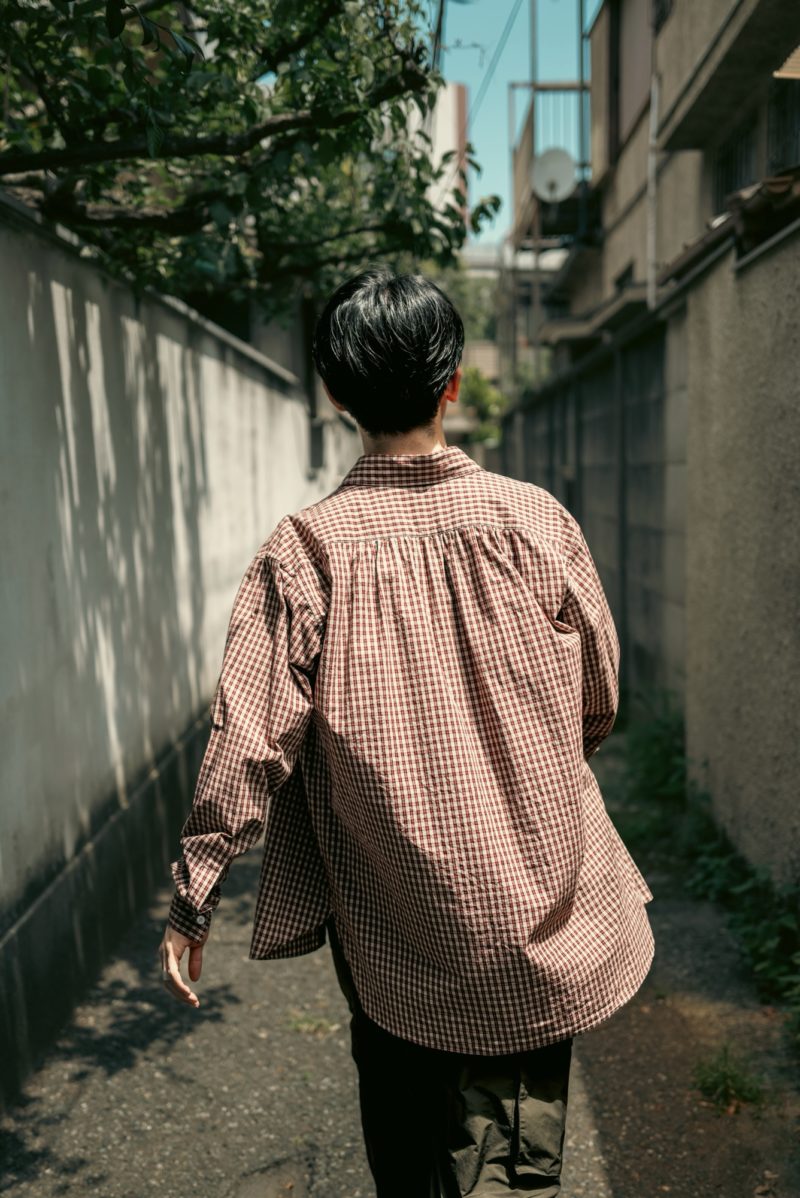 シャツの型に関してはAlgernonで去年からリリースしているMakishimaをベースにしている。Makishimaは程よく落とした肩幅とゆったりとした身幅が特徴のシャツで、ボックスシルエット気味のベーシックなシャツだ。このMakishimaのシルエットを踏襲しているので着る人を選ばず、ギャザーシャツにありがちな『着丈が長い。身幅も広い。ただデカい』という着辛さもクリアしている。何も考えずにサラッと着流すくらいの塩梅で丁度良い。