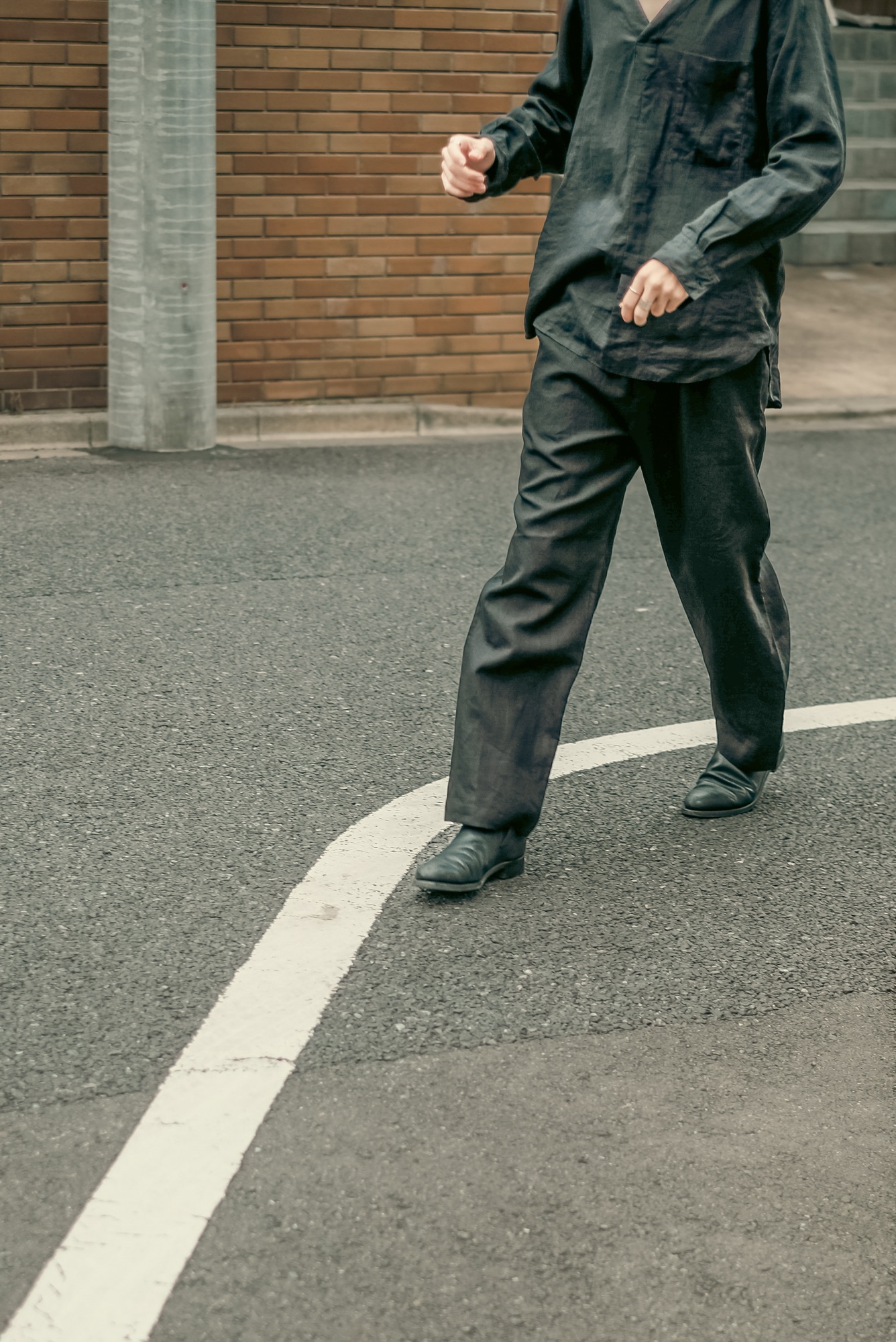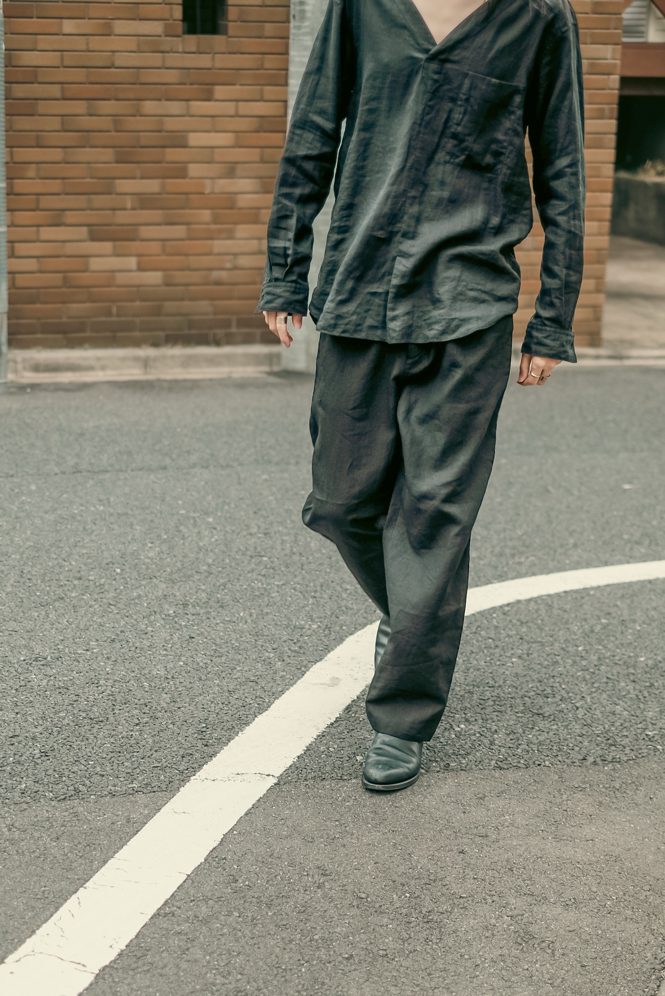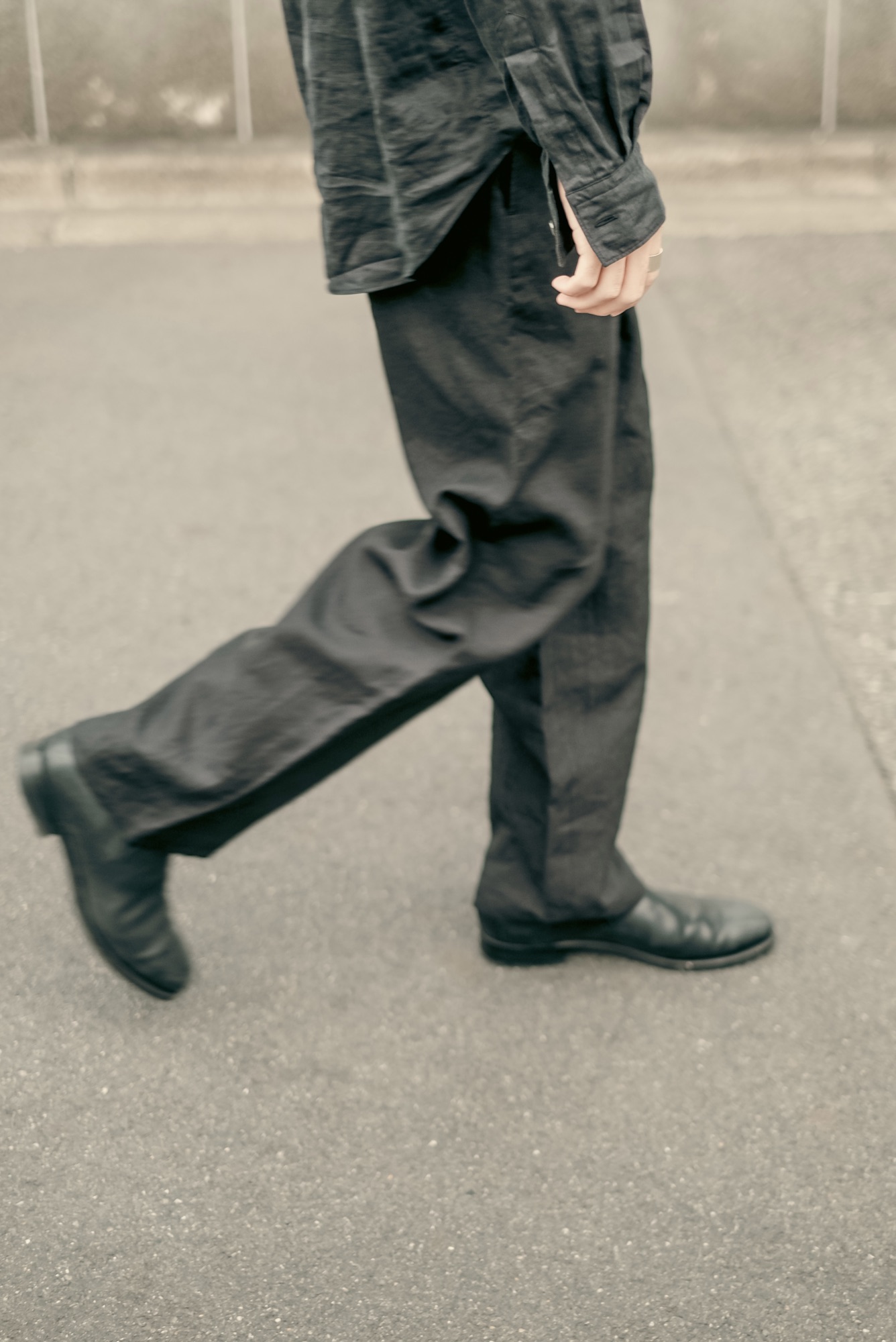 Augus同様に柔らかい生地を使用しているからこそ、歩く度に動きが出てシルエットに変化が生まれるところが最大の特徴。柔らかい生地感は着用者の快適な穿き心地も同様に叶えてくれる。そして歩いていない時はストンと綺麗に落ちるシルエットが楽しめ、何より脚が綺麗に見える。快適さとキチンと感のどちらも得られるのがこのパンツの魅力だ。