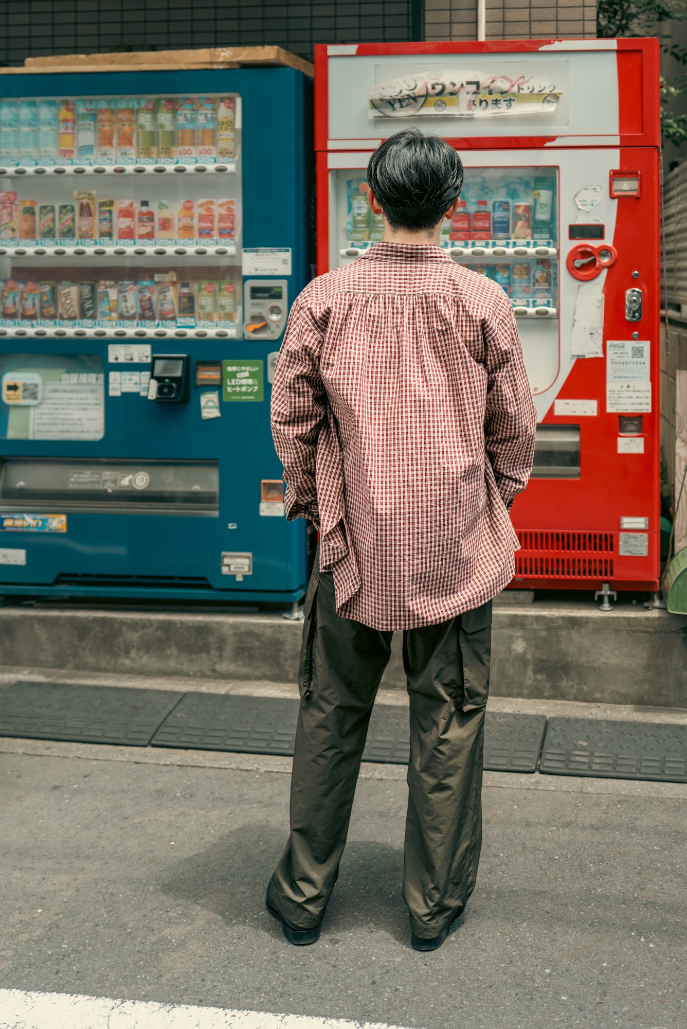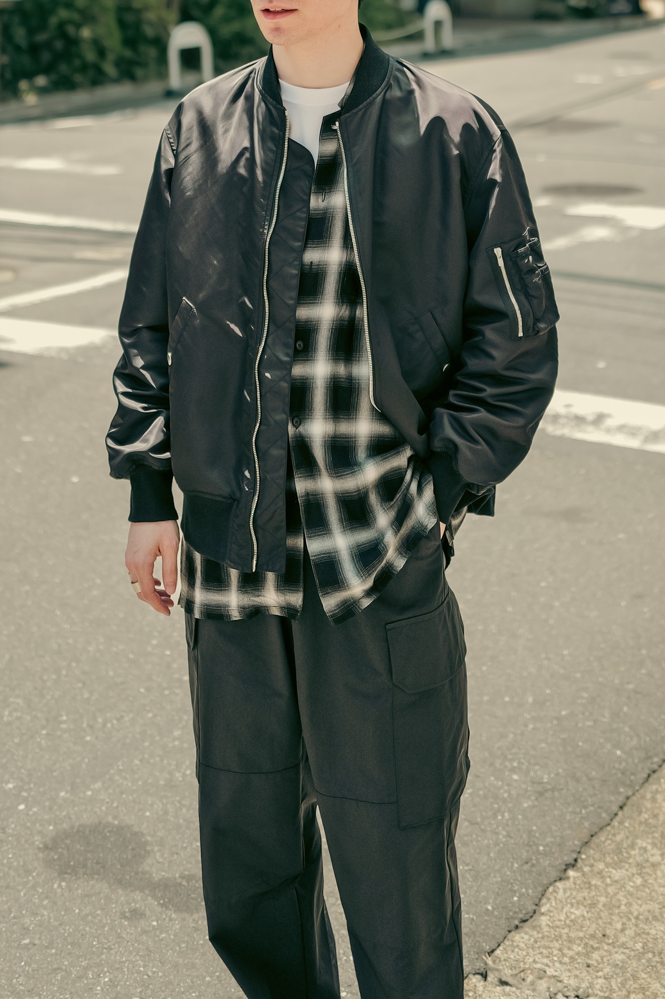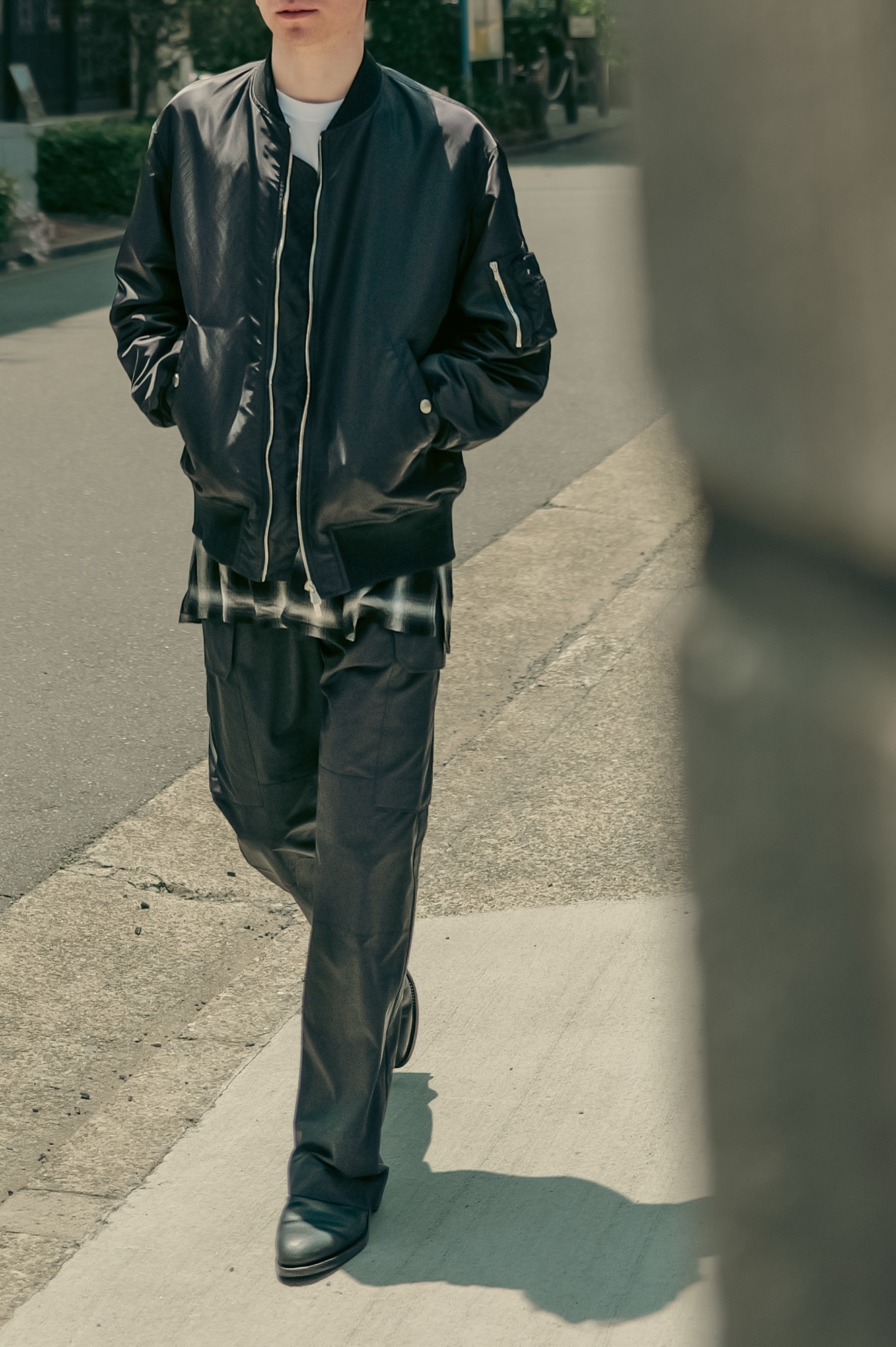 ご存知の方もいらっしゃると思うが、Algernonがブランドとして始動して初めてリリースしたアイテムがこのAugusだ。Algernonは僕個人が所有しているアイテムをベースにしつつ、それらをよりブラッシュアップして製品化することが多い。このAugusについても同様だ。ベースにしているのはフランス軍のM-47パンツ。ファッションが好きな方ならきっとご存知の方も多いだろうし、数多のブランドがサンプリングしているアイテムなので、詳細は省かせてもらう。個人的にオリジナルやレプリカを含めてM-47パンツは複数本所持していて、シルエットの綺麗さとスタイリングの汎用性の高さから、デニムと同じくらい着用頻度が多いパンツでもある。この無骨で土臭いシルエットはそのままに、記事を柔らかく上質な物に変えたら面白いことになりそうだと思いAugusをリリースした。初めはネップ感の残るコットンシルク生地で、その後は夏場に快適に穿けるホワイトリネン生地、そして画像のポリエステルナイロン生地のテックパンツとして3バージョンをリリースしている。