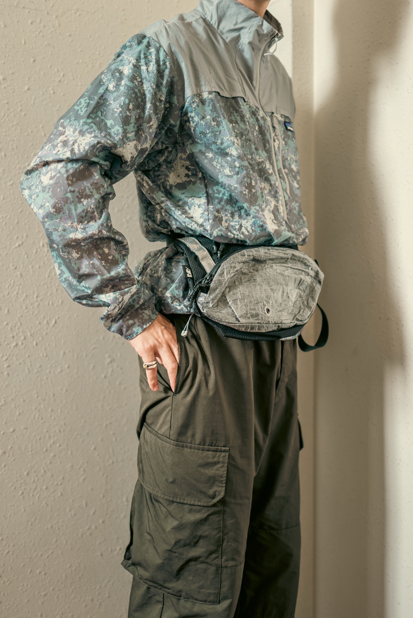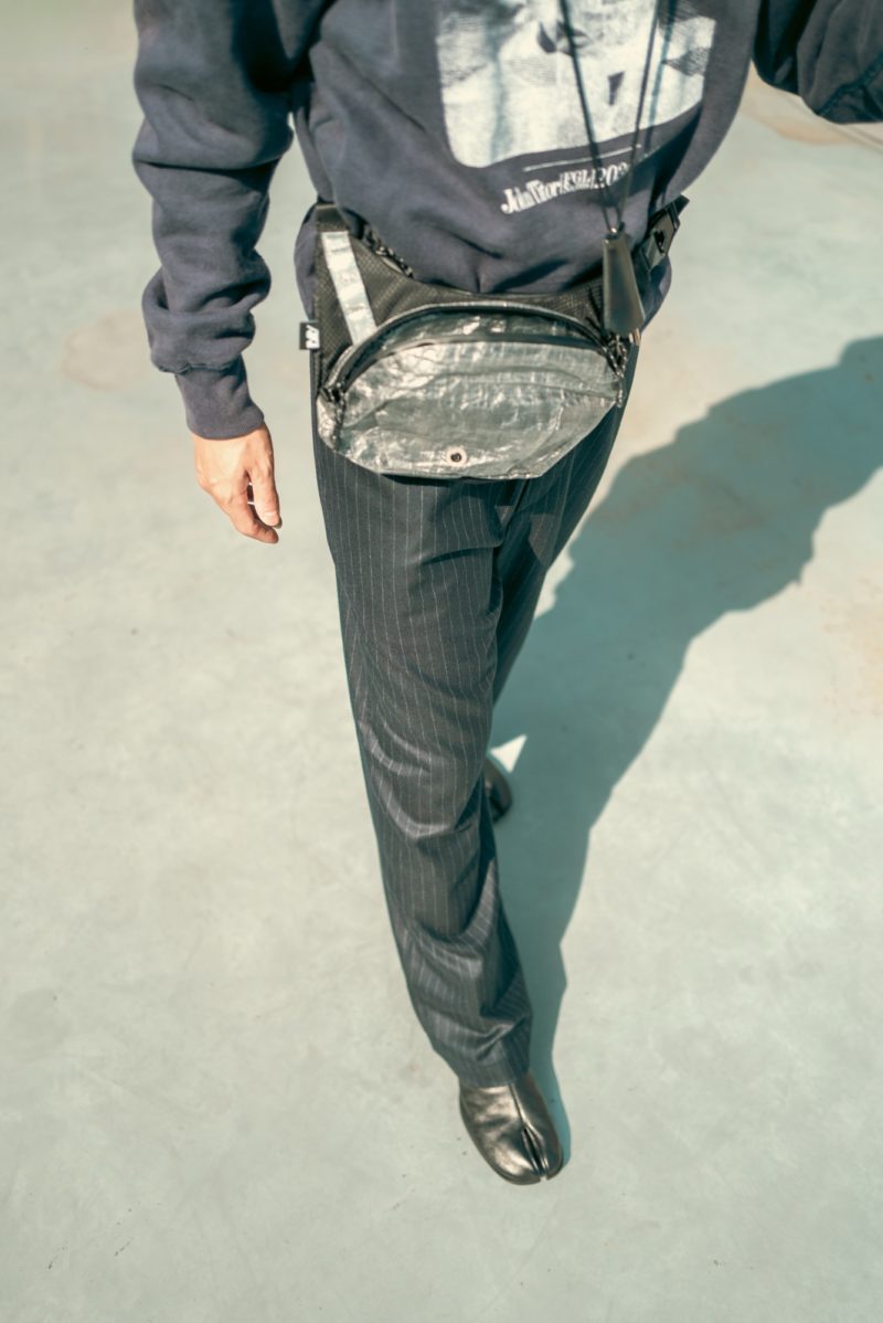 M-47パンツをベースにしたAugusだが、裾部分のベルトは敢えて取り払っている。僕自身が日頃から様々な種類の靴を履くのだが、靴の種類によってパンツの裾のバランスを必ず調整する。その際にAugusならウエストがドローコード仕様なので、紐でウエスト位置の微調整が可能だ。裾の溜まり具合を自由に調整出来るので、多種多様な靴とのバランスが取りやすい。ハイテクスニーカーでもローテクスニーカーでも、革靴でもブーツでもサンダルでも対応可能だ。少なくとも僕はAugusを穿いている際、靴との合わせと裾のバランスで不自由を感じなかった。