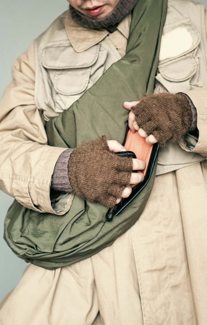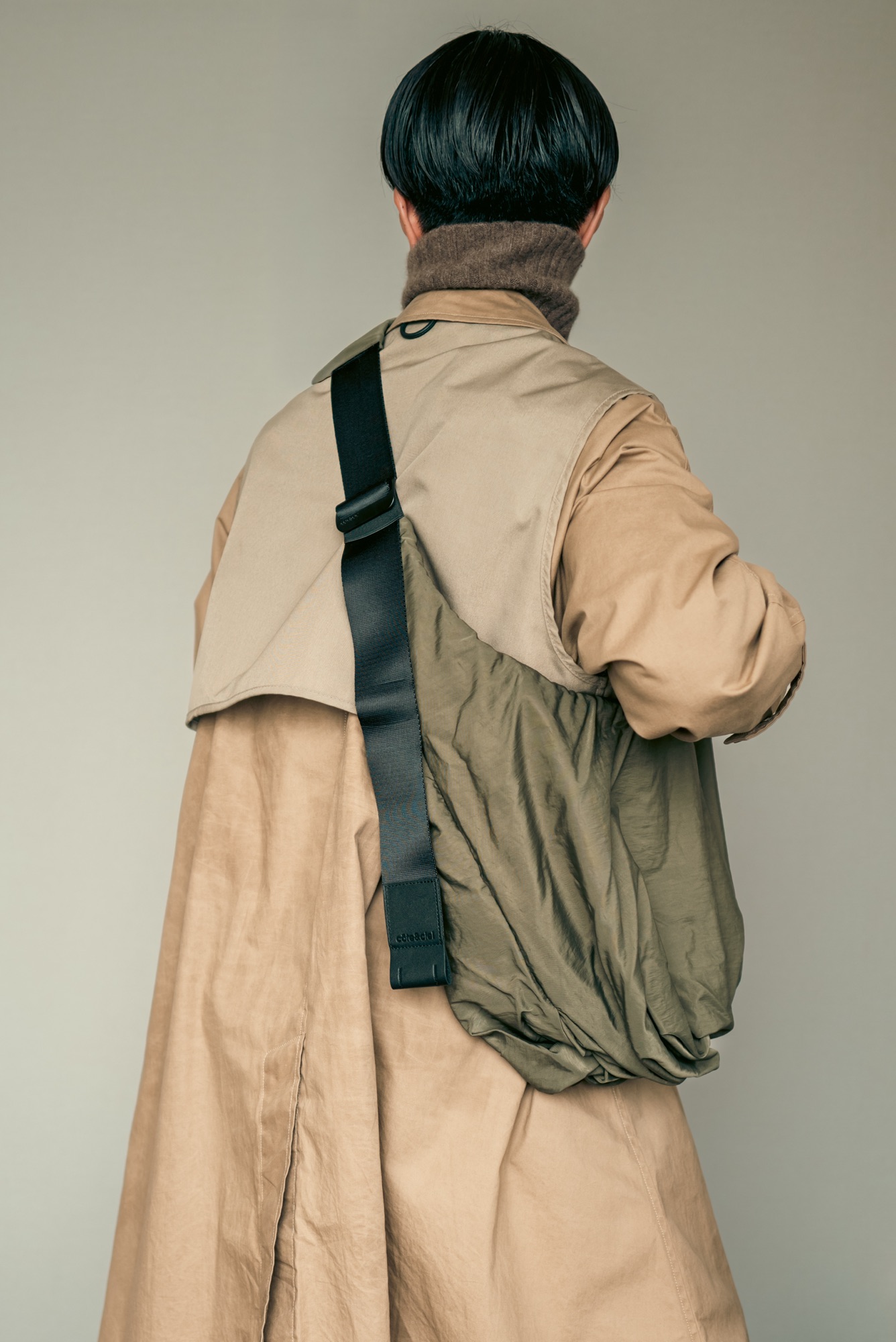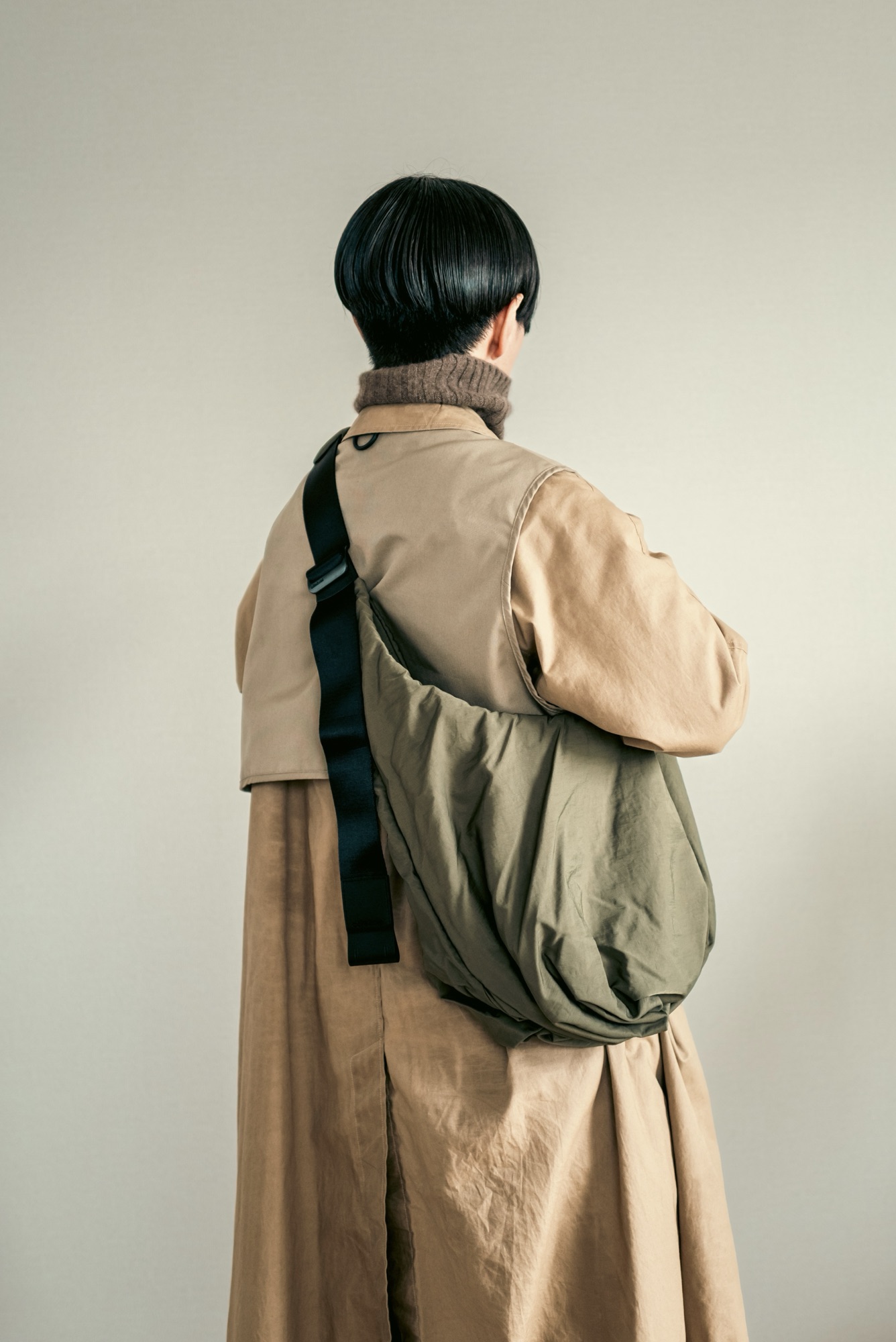 荷物が少ない時は斜めがけしてクロスボディバックとして使用し、荷物が多い場合はワンショルダーのバックとして使っている。人体工学を元にデザインされているので斜めがけをした際は重量を感じづらいし、ストラップが柔らかいのでワンショルダーでの使用時も肩に食い込みにくいのが嬉しい。あとは化繊特有のデラデラとした素材感が無いため、写真のようにコットンやウール、カシミアといった天然素材を軸にしたスタイリングでも違和感なく溶け込んでくれるのも有り難い。
