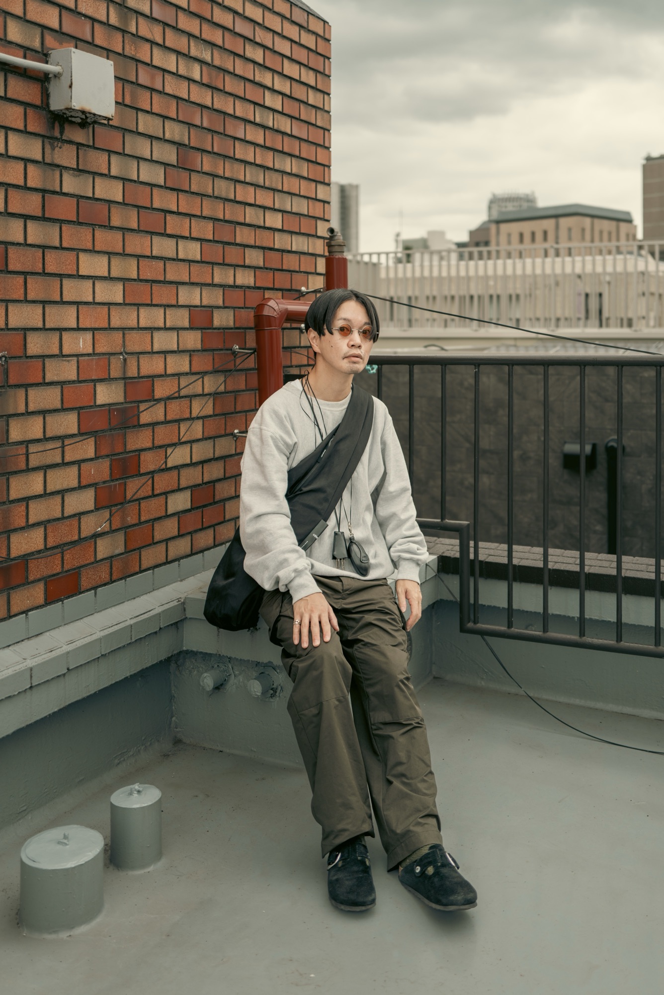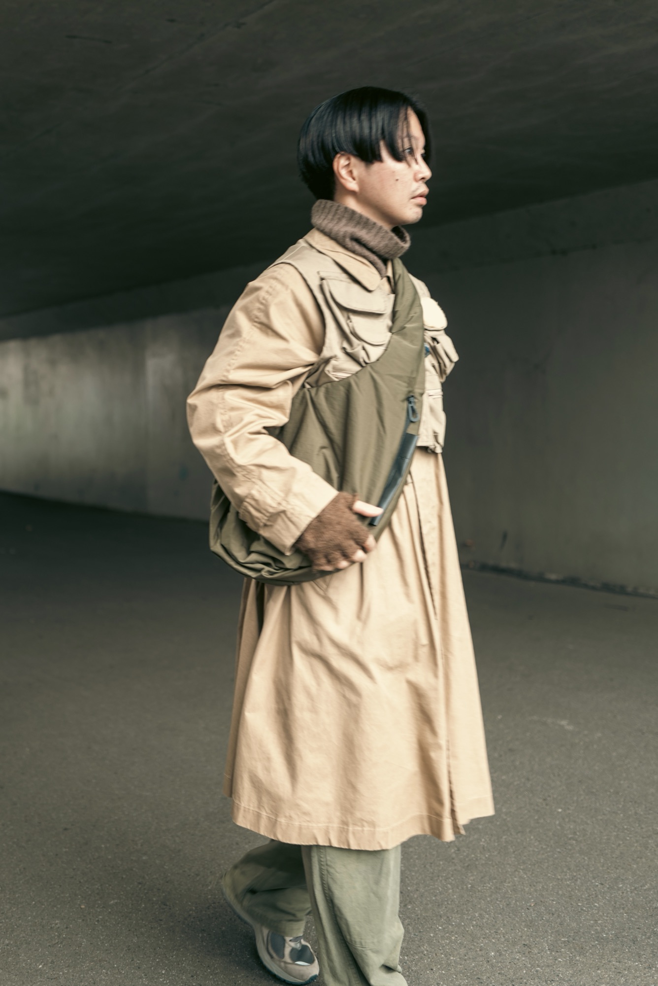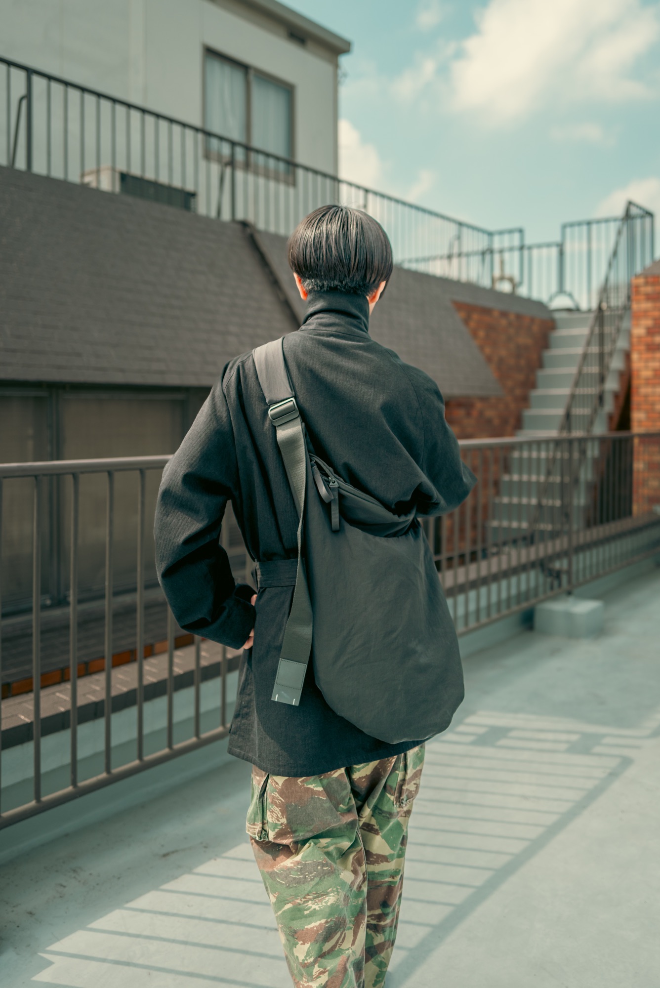 荷物が少ない時は斜めがけしてクロスボディバックとして使用し、荷物が多い場合はワンショルダーのバックとして使っている。人体工学を元にデザインされているので斜めがけをした際は重量を感じづらいし、ストラップが柔らかいのでワンショルダーでの使用時も肩に食い込みにくいのが嬉しい。あとは化繊特有のデラデラとした素材感が無いため、写真のようにコットンやウール、カシミアといった天然素材を軸にしたスタイリングでも違和感なく溶け込んでくれるのも有り難い。