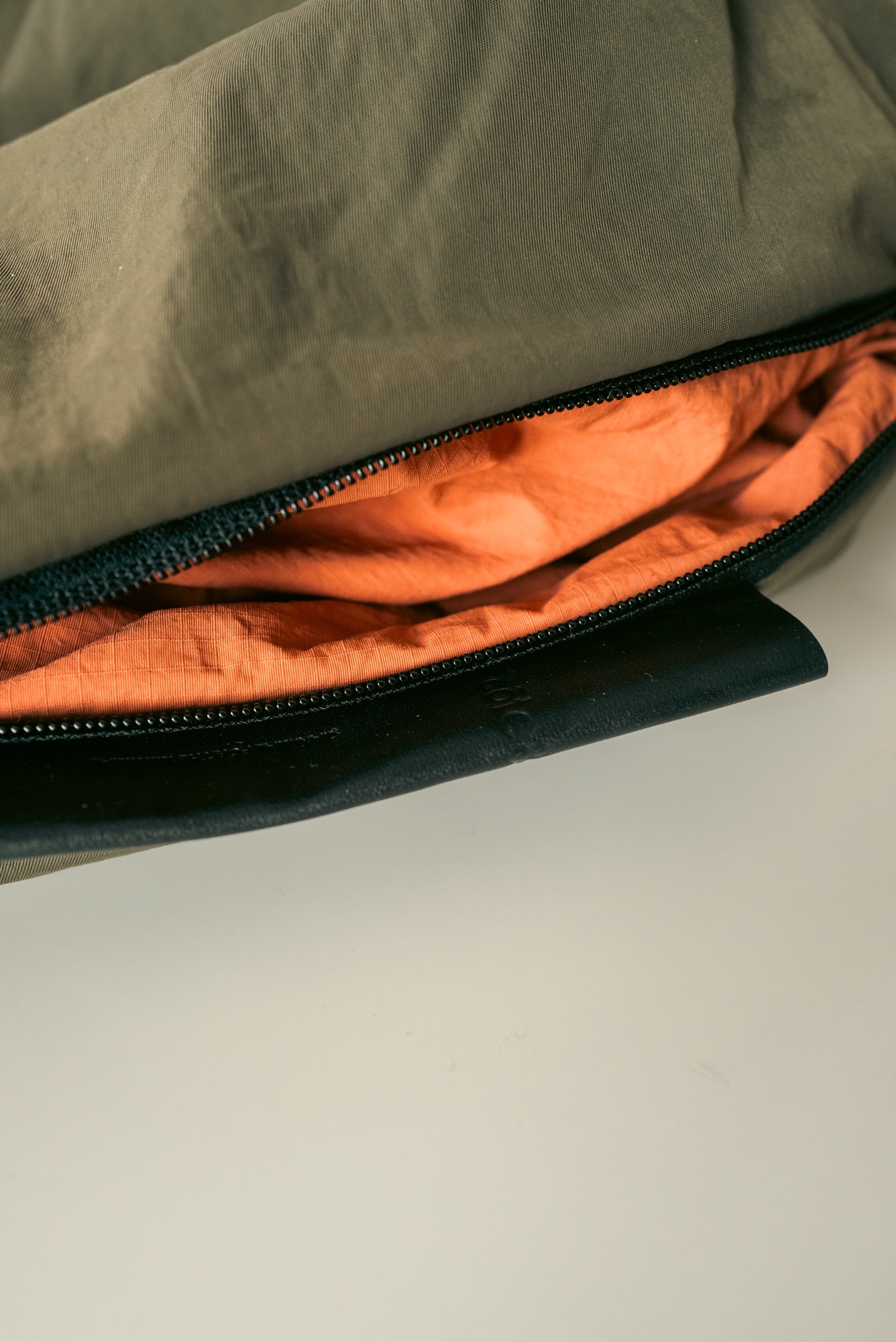 僕が新しくお迎えしたHyco-Sという画像のバッグはブランドの定番品ながら、今回のコレクションテーマに則って細かい部分でアップデートが施されている。フライトジャケットをイメージして改良されたHyco-Sはボディカラーと内面のレスキューオレンジのカラーだけでなく、ジャケットの前立てを彷彿とさせるコンセプチュアルなディテールが流用されている。軍用量産品の良くも悪くも安っぽい素材感とは異なり、深みのある細やかなテクスチャも魅力だ。手に触れる感触もとても気持ちが良い。肌当たりが良いバッグを使うと幸福度が増すという当たり前のことを、このバッグを使って僕は久しぶりに思い出した。